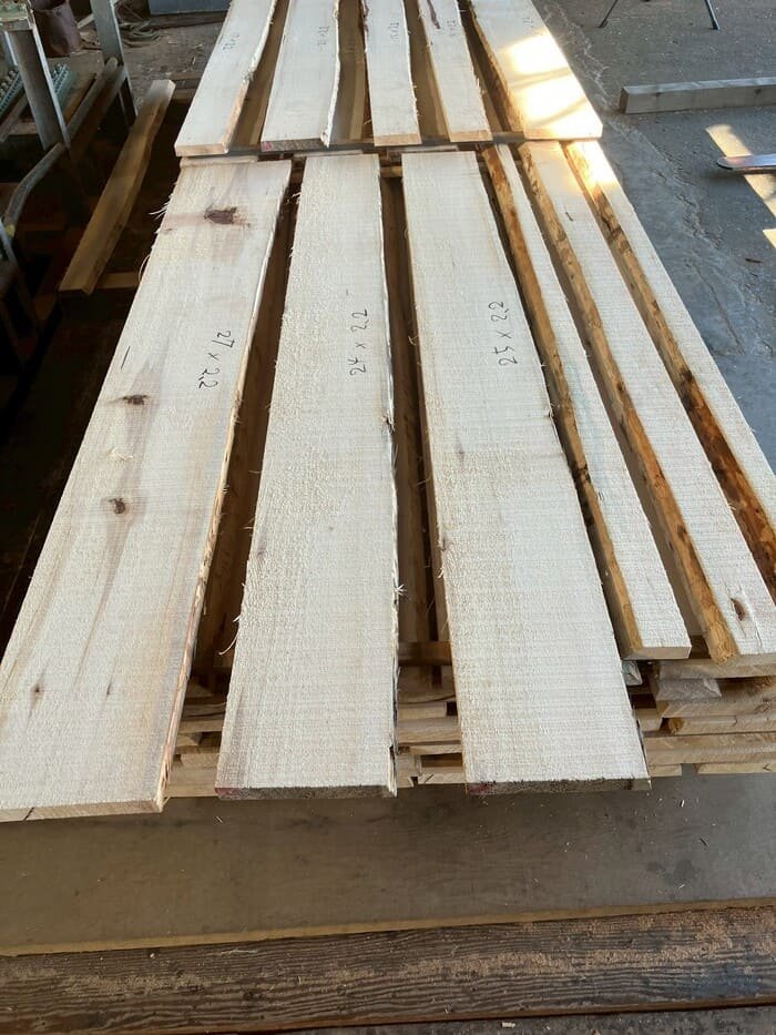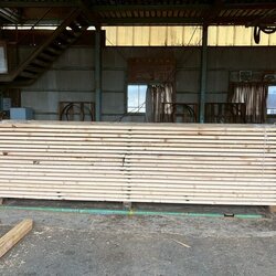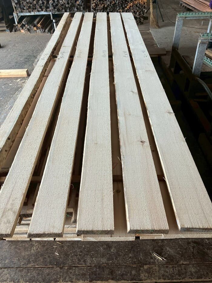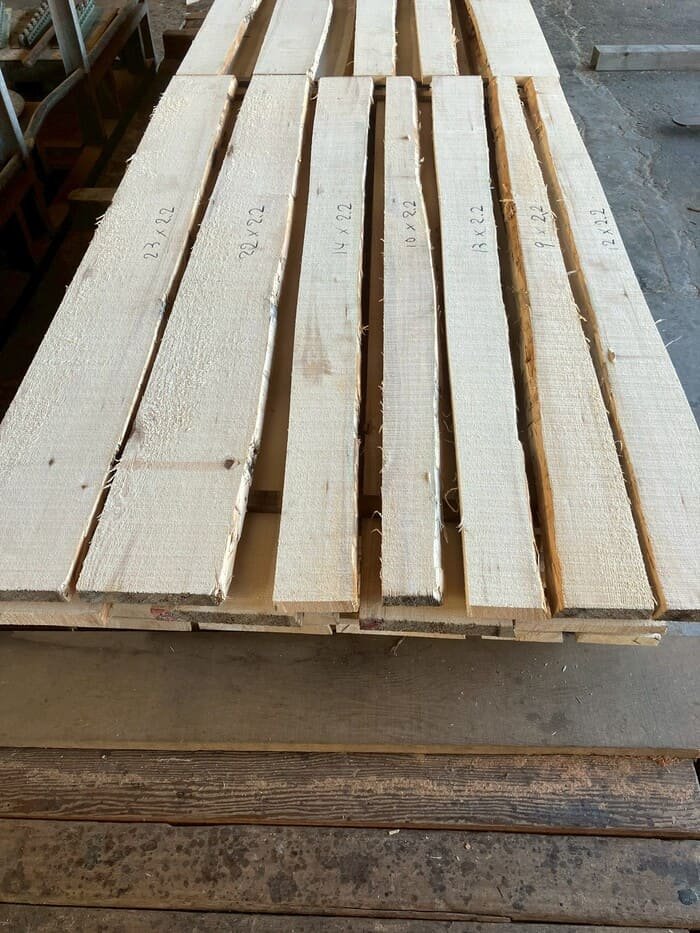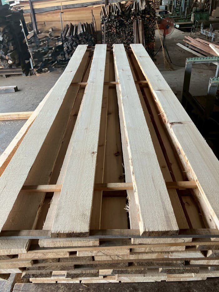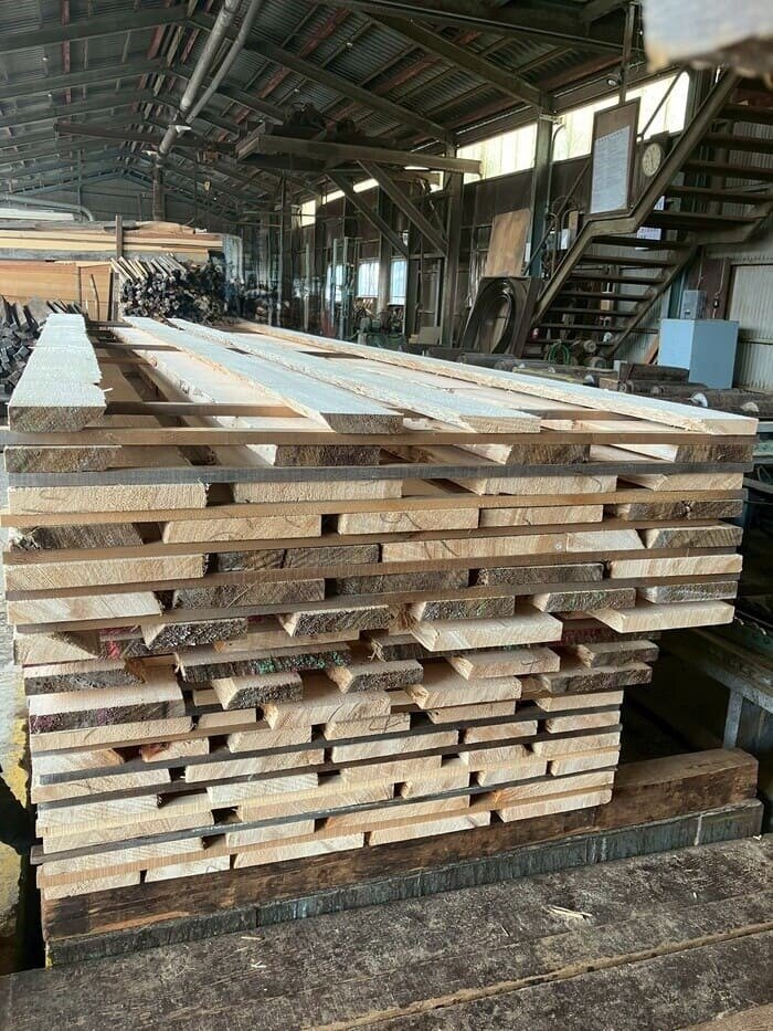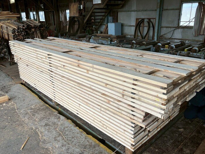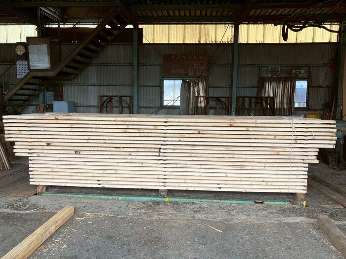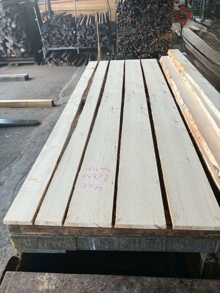 長さ11.1mのバルサム丸太を根側2.2m、真ん中4.1m、末側4.8mに長さをカットし厚み34mmに製材しています。