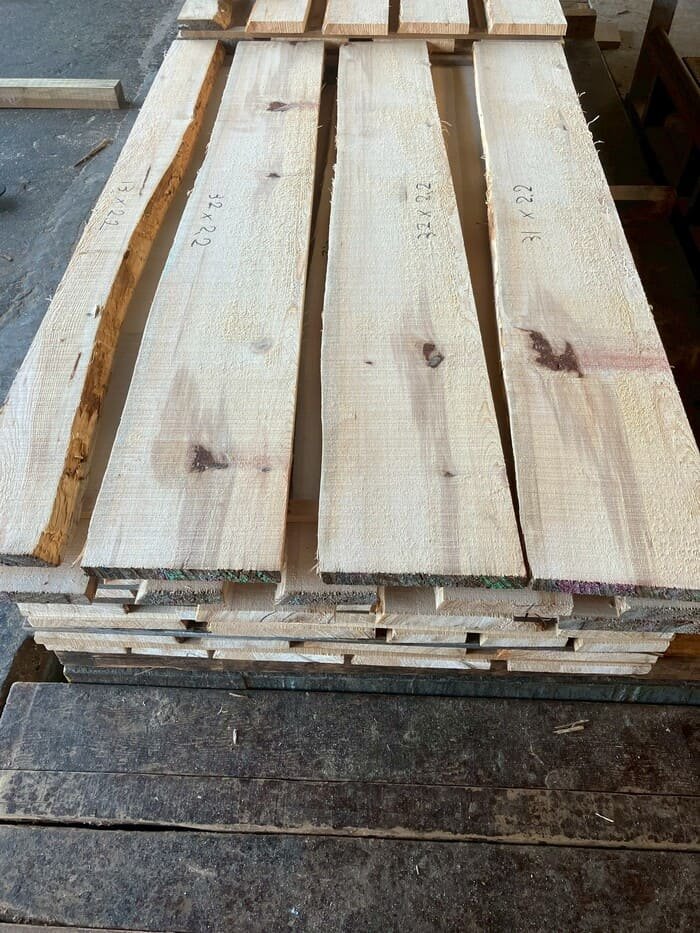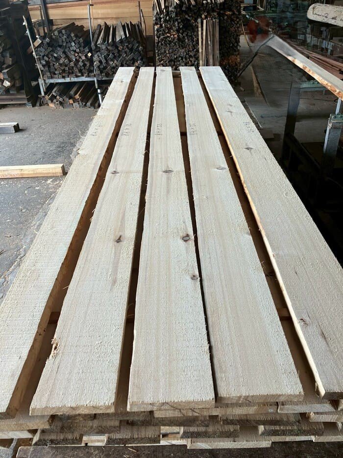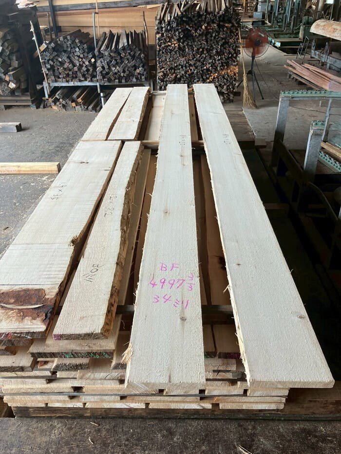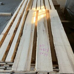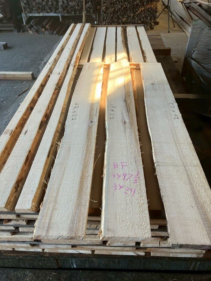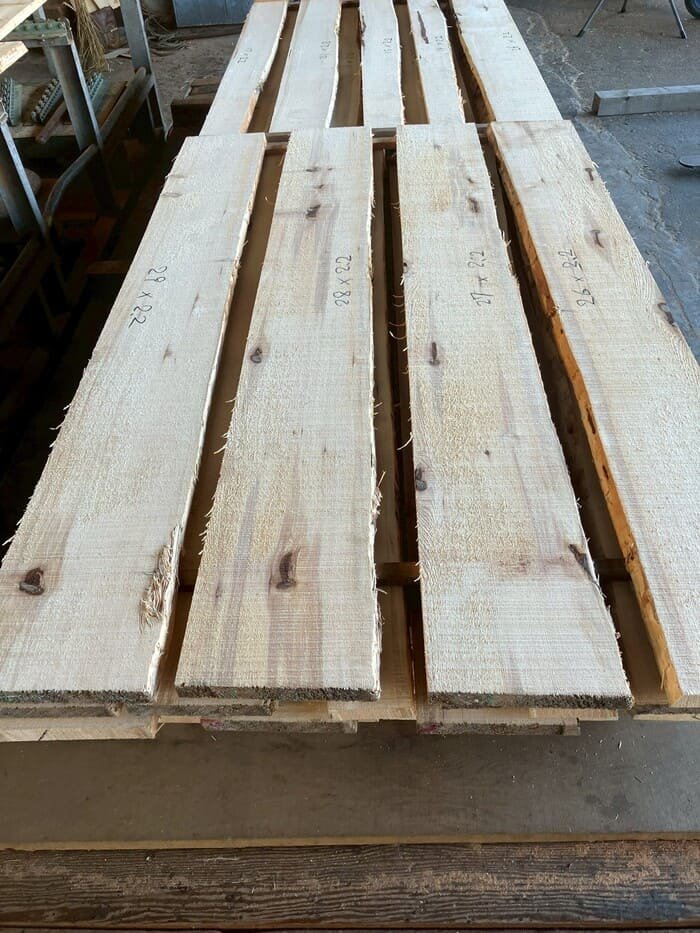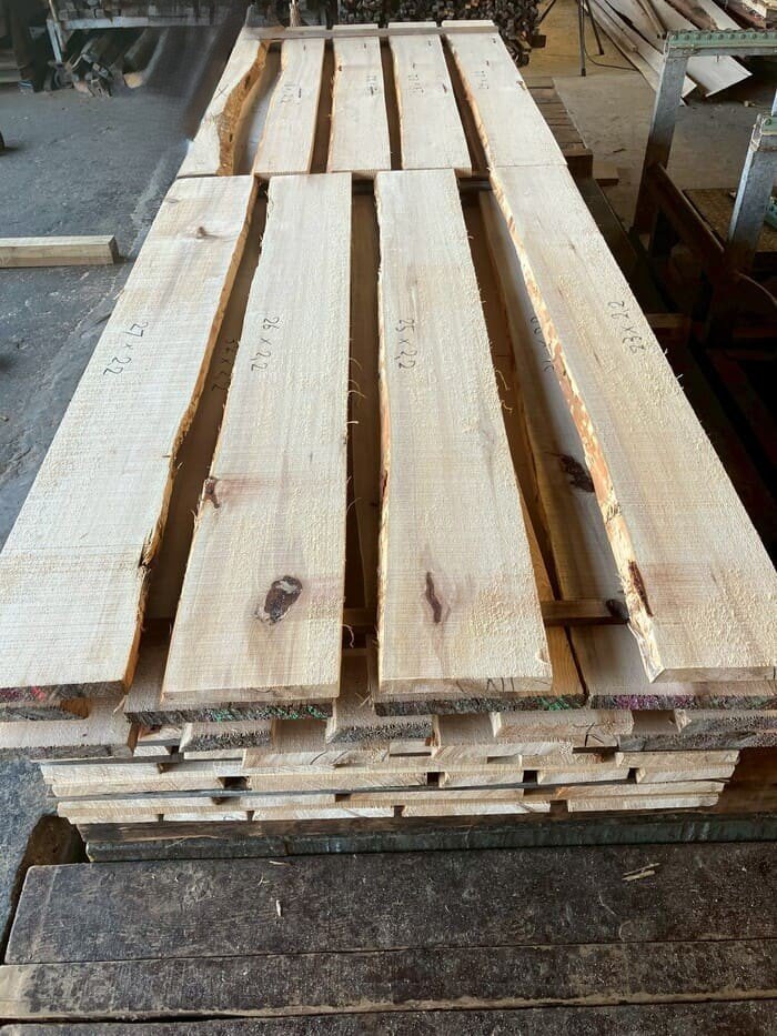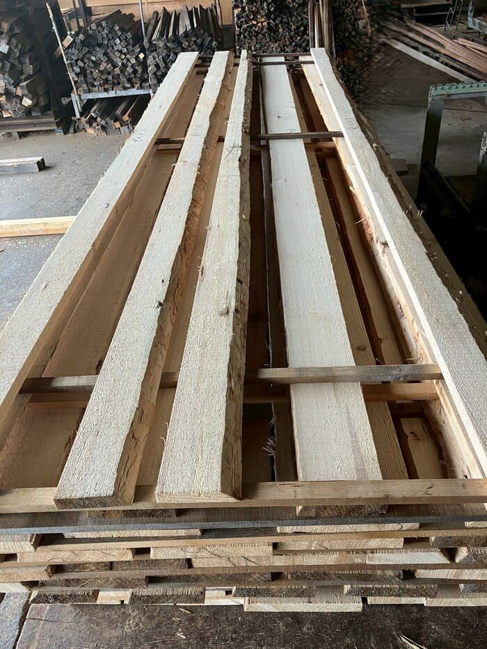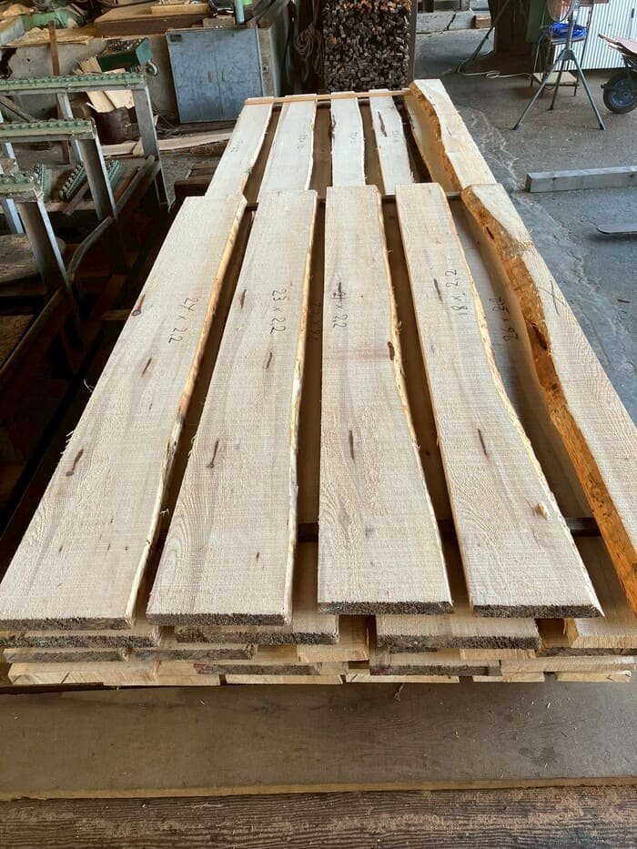 長さ11.1mのバルサム丸太を根側2.2m、真ん中4.1m、末側4.8mに長さをカットし厚み34mmに製材しています。