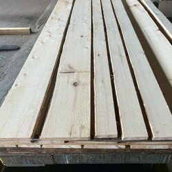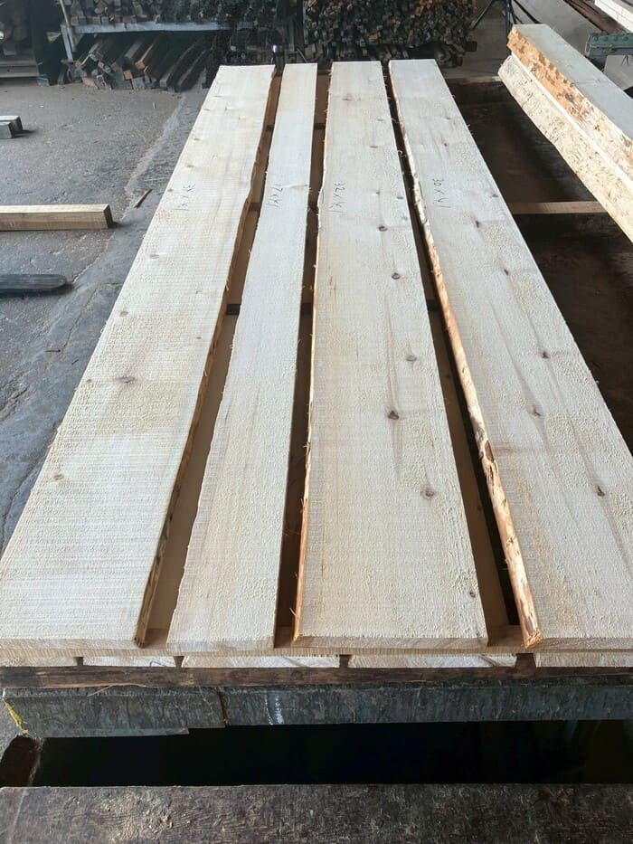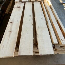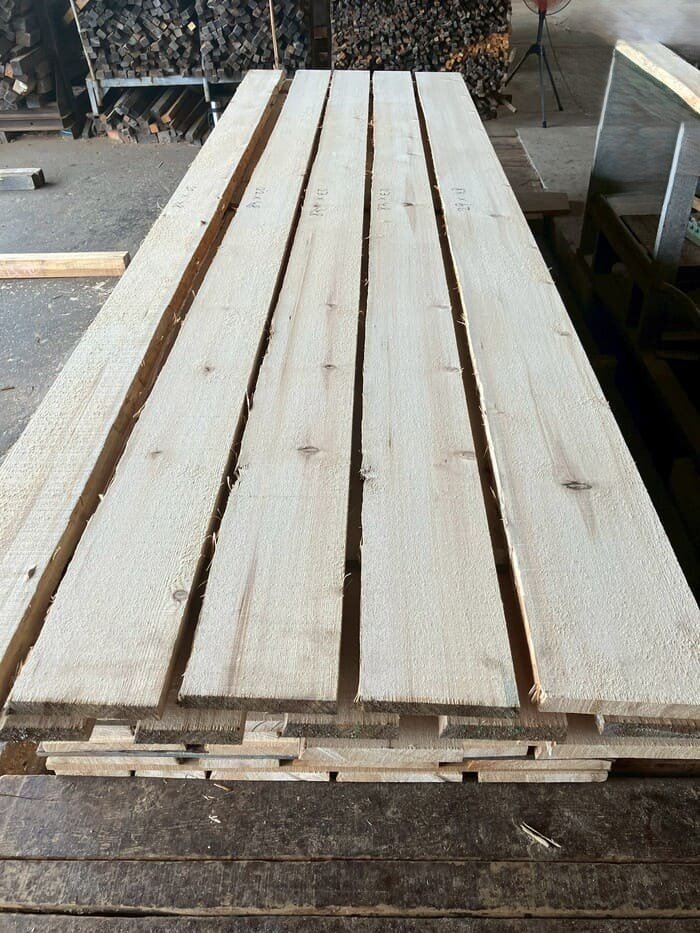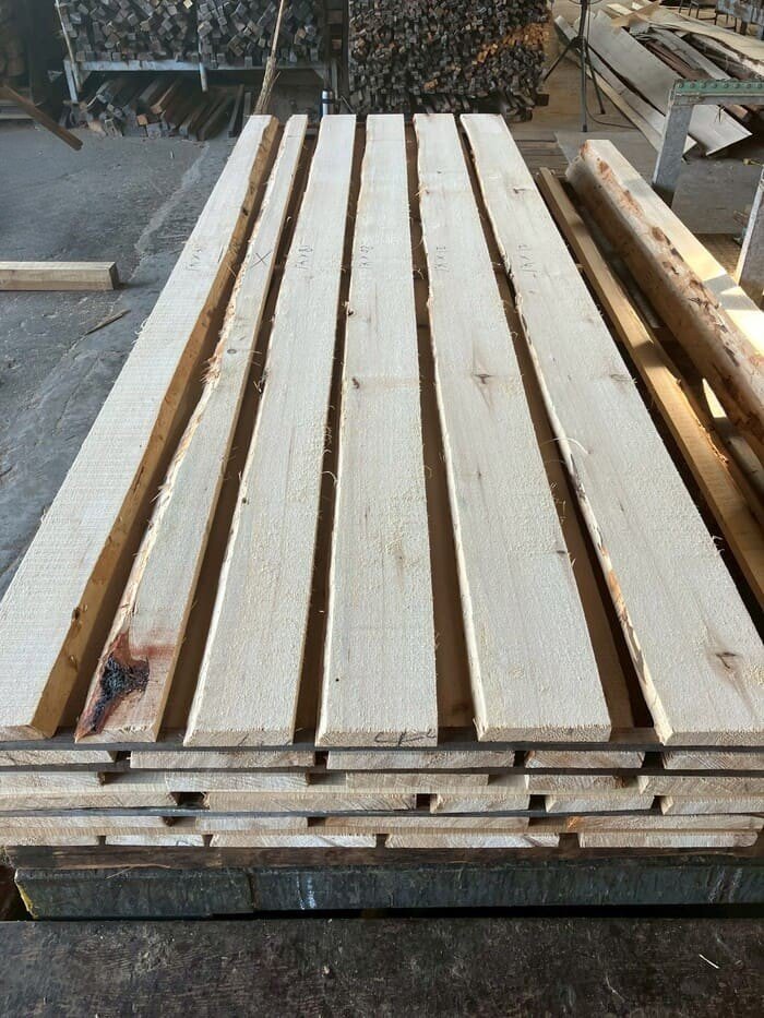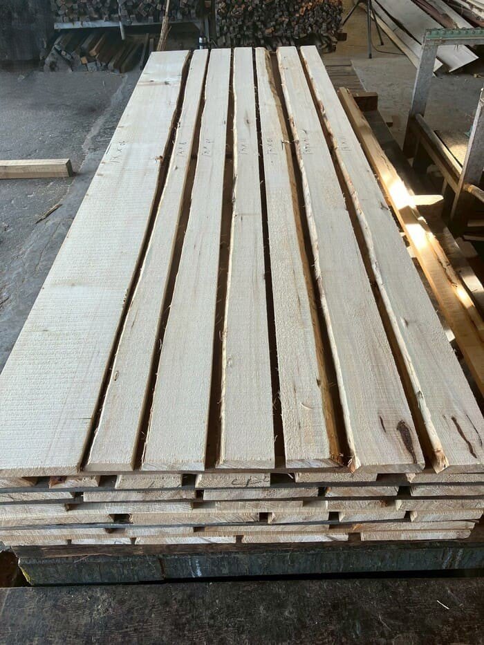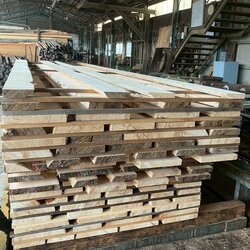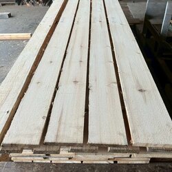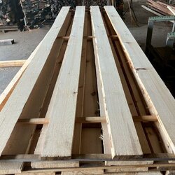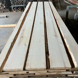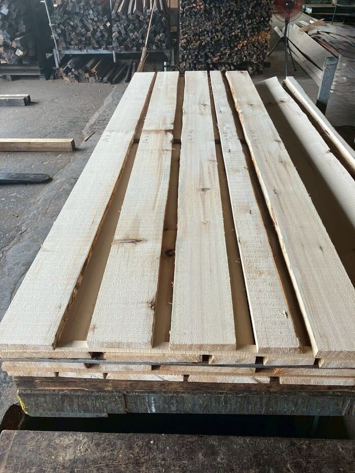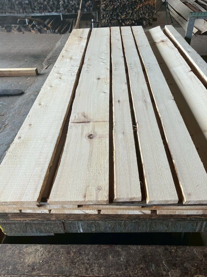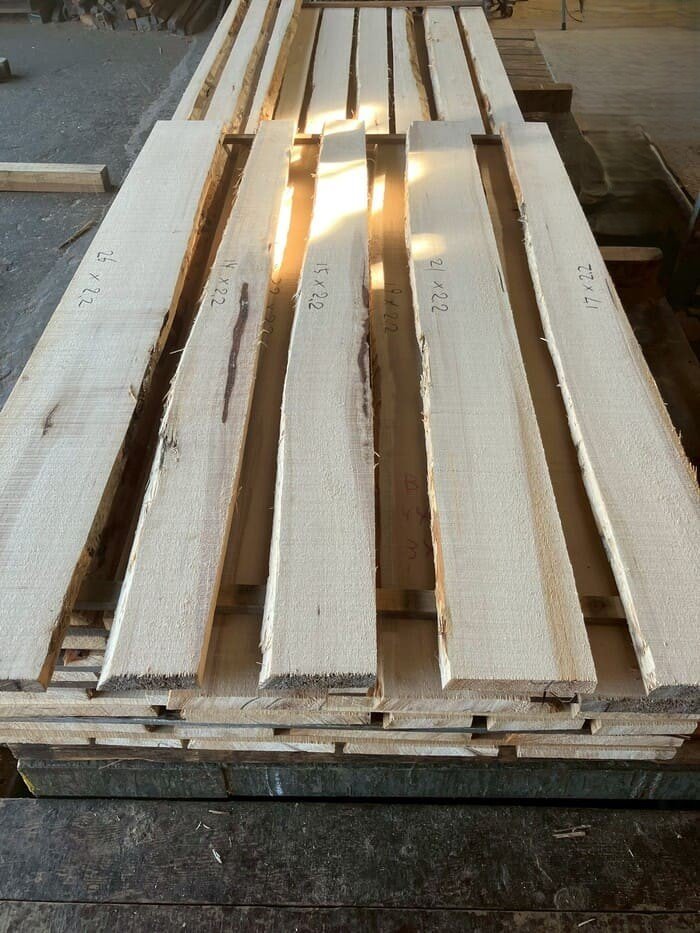 長さ11.1mのバルサム丸太を根側2.2m、真ん中4.1m、末側4.8mに長さをカットし厚み34mmに製材しています。