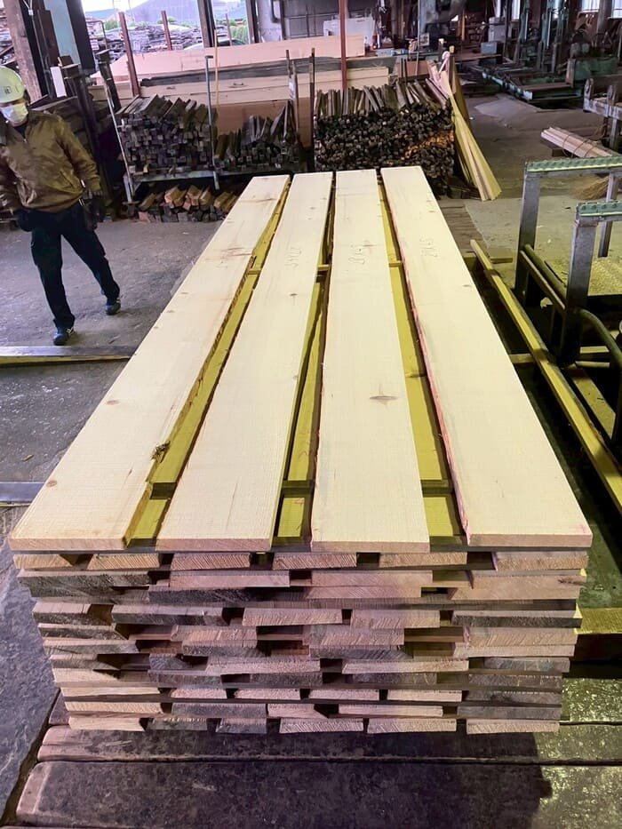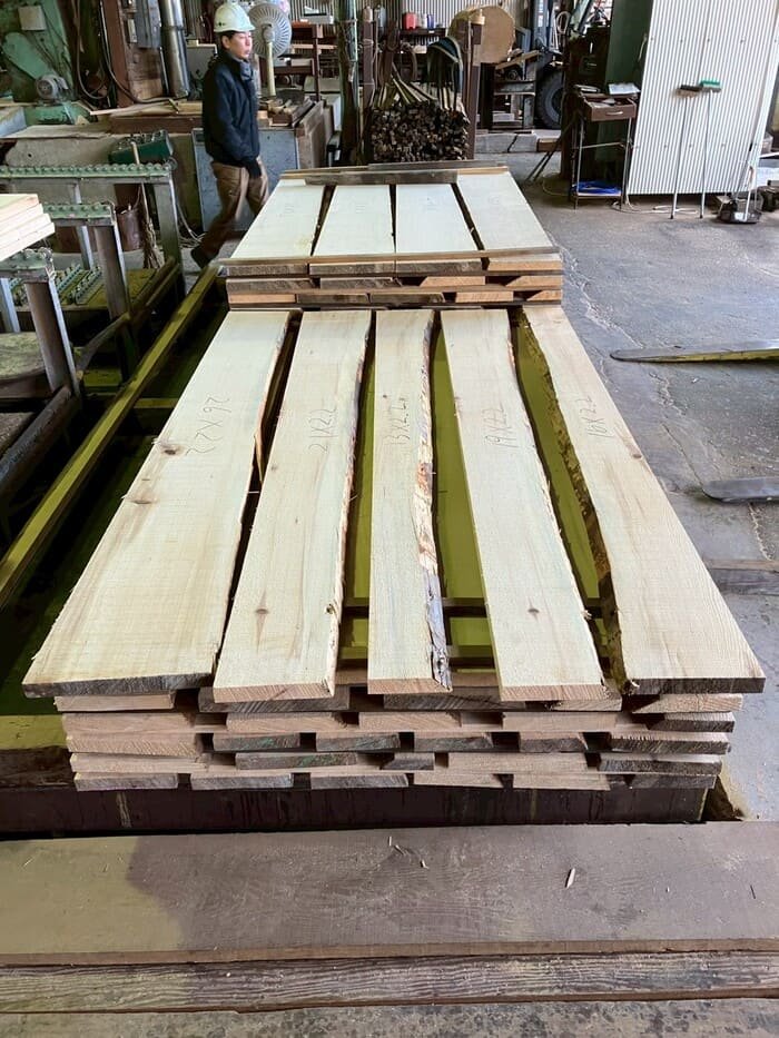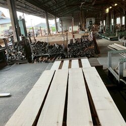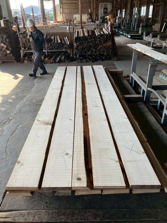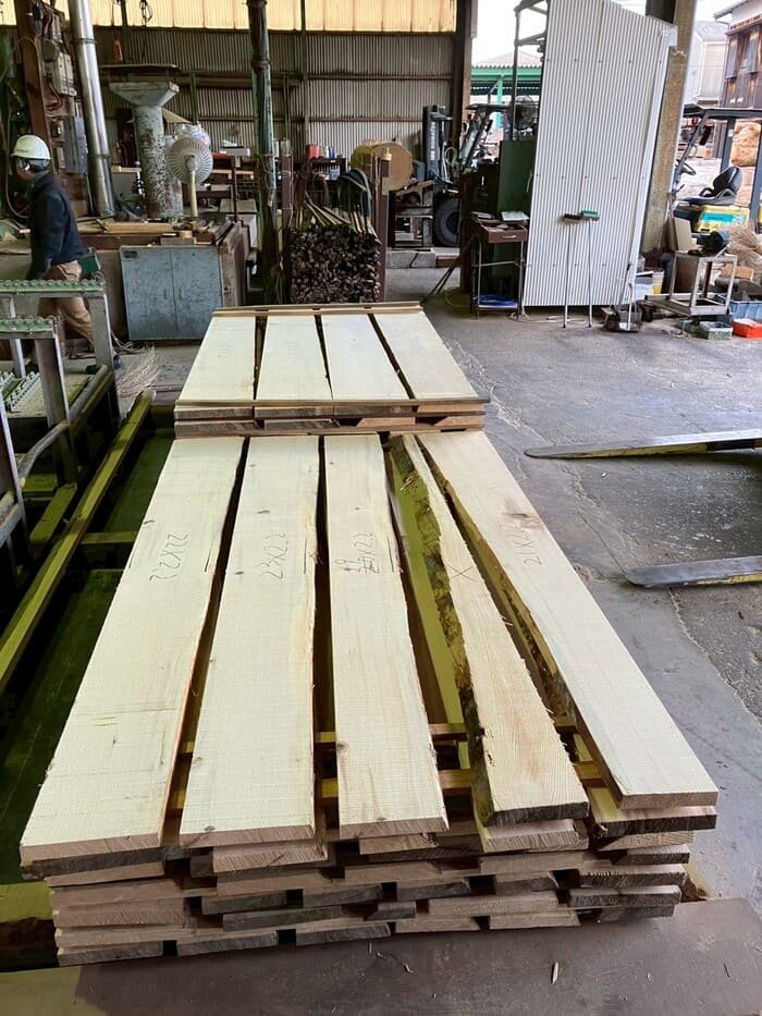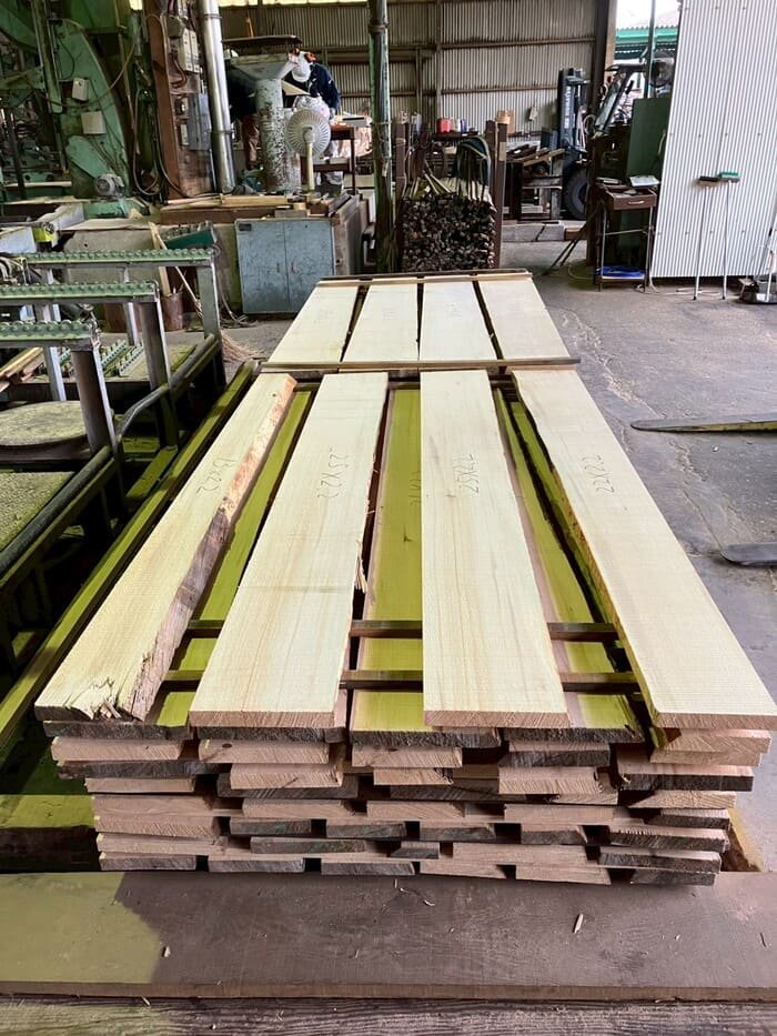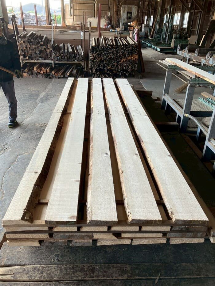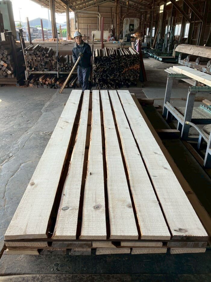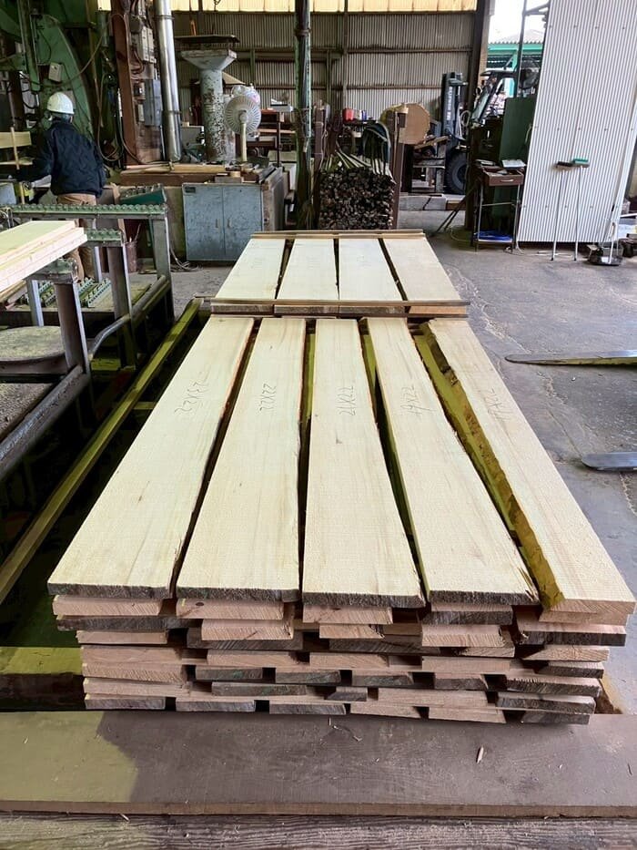 長さ11mのバルサム丸太を根側から2.2m、4.5m、4.4mにカットし、厚み34mmで製材をしています。