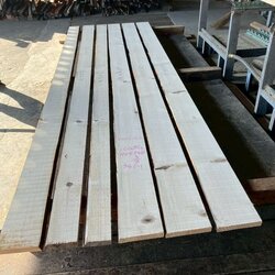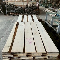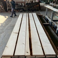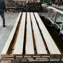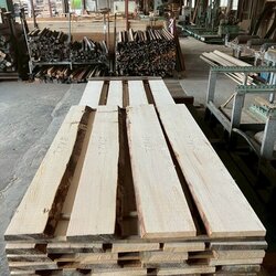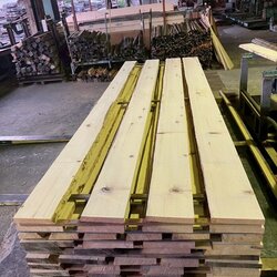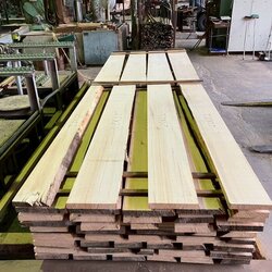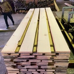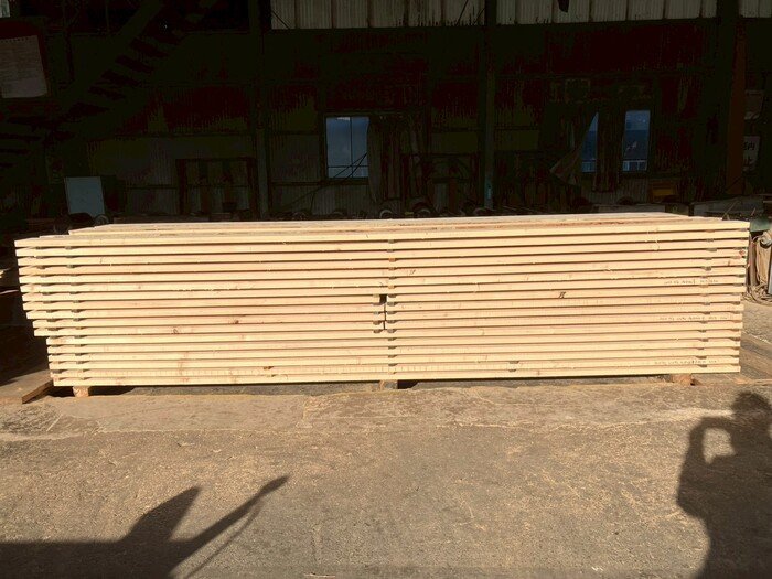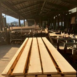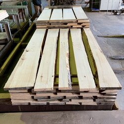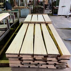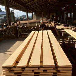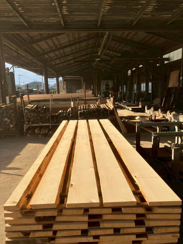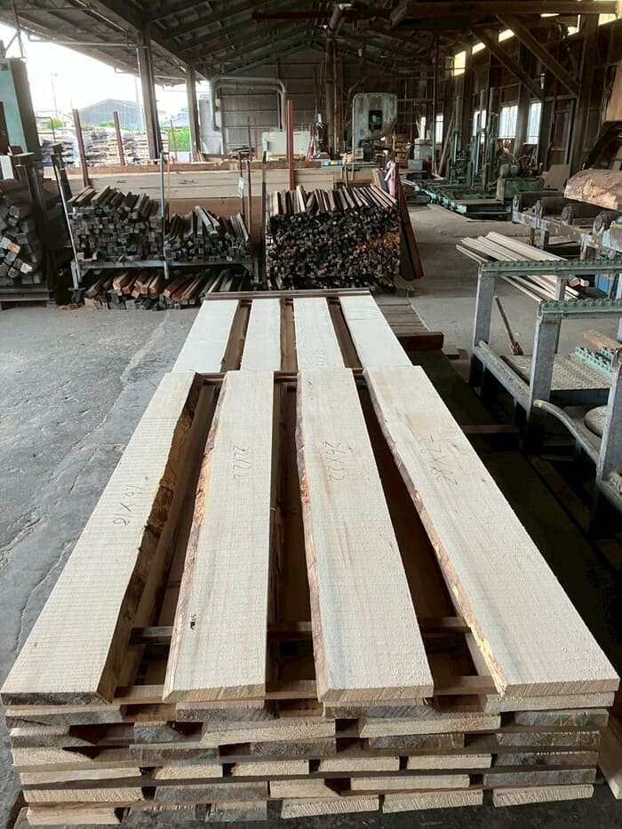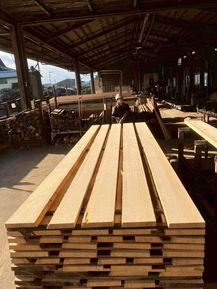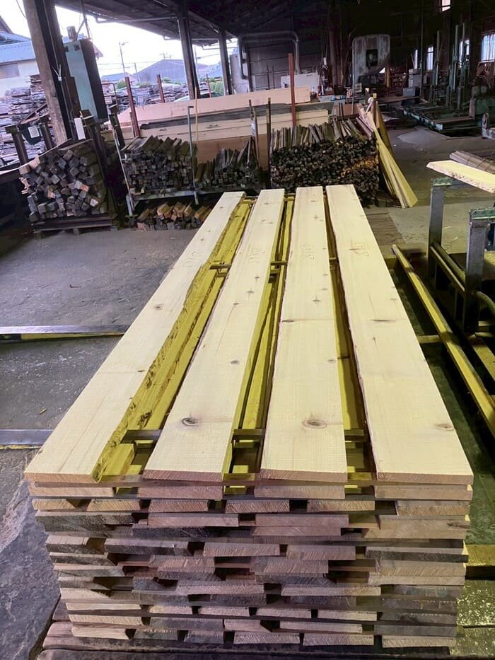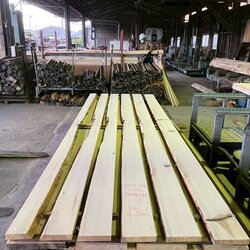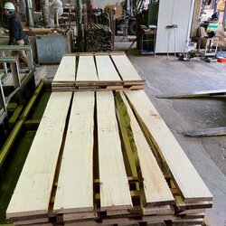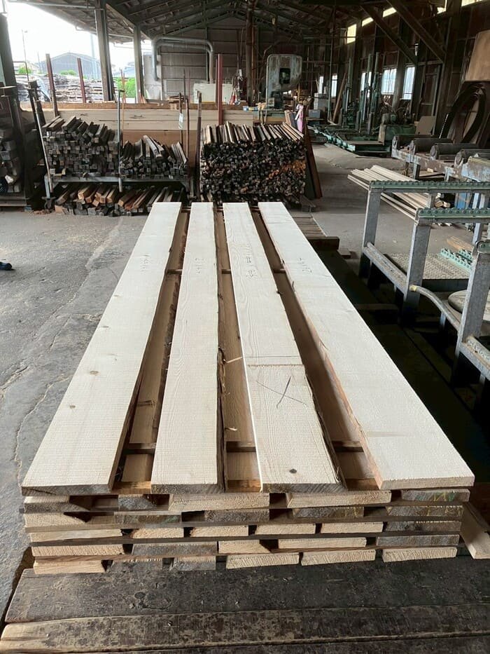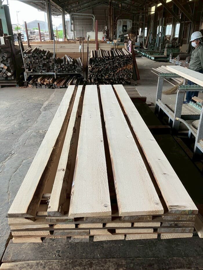 長さ11mのバルサム丸太を根側から2.2m、4.5m、4.4mにカットし、厚み34mmで製材をしています。