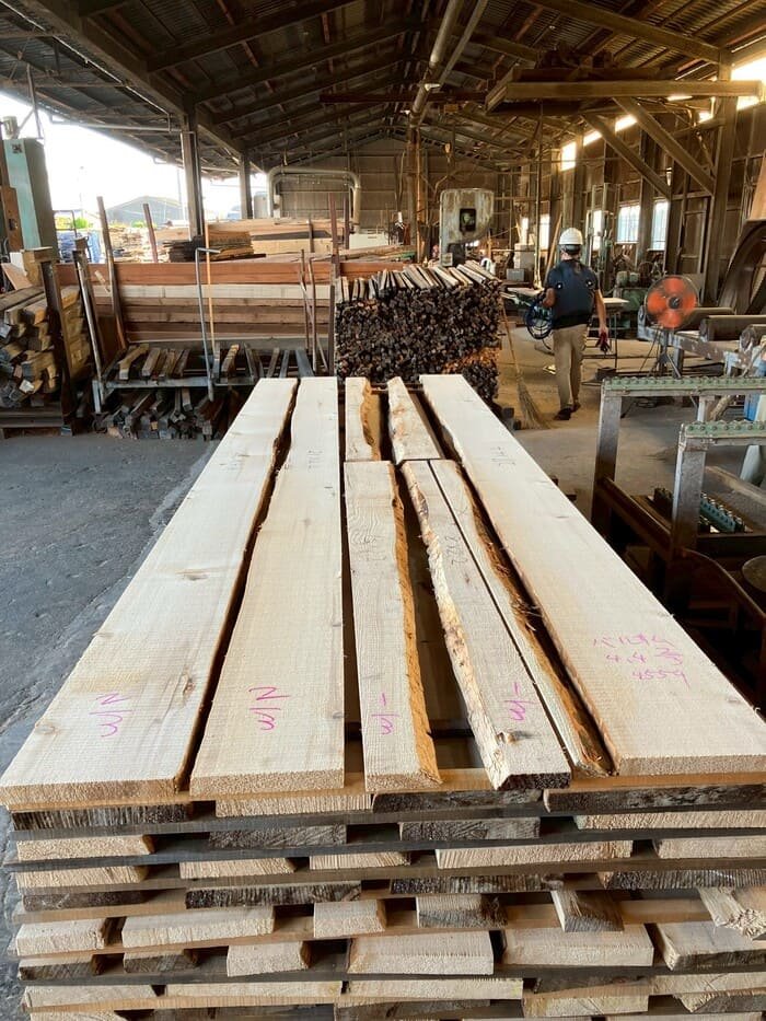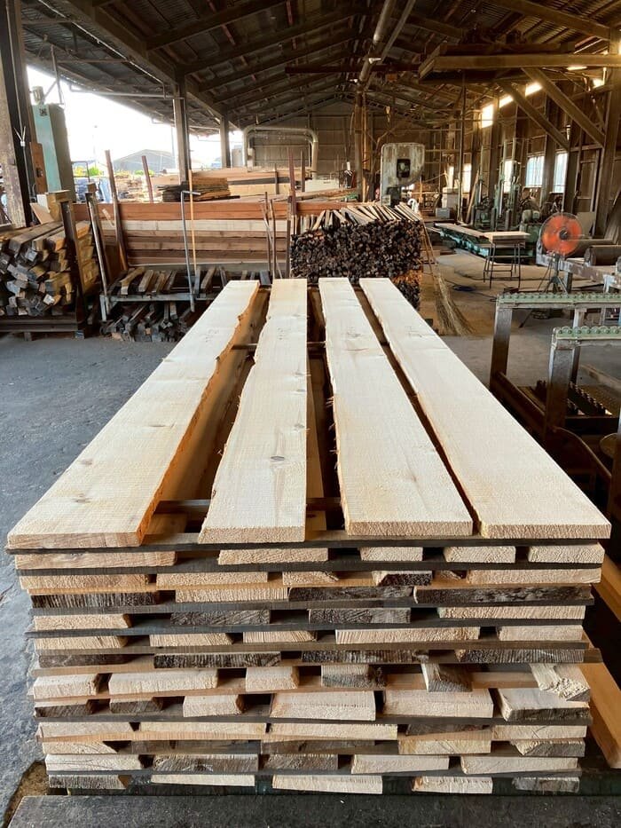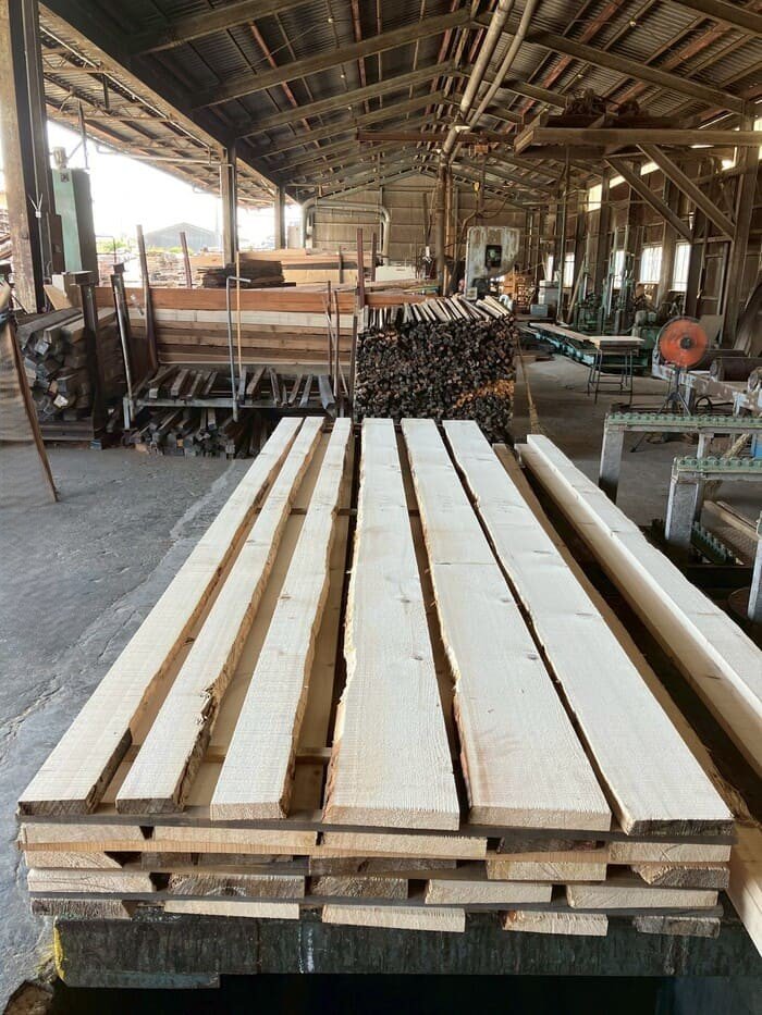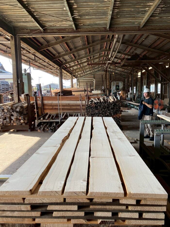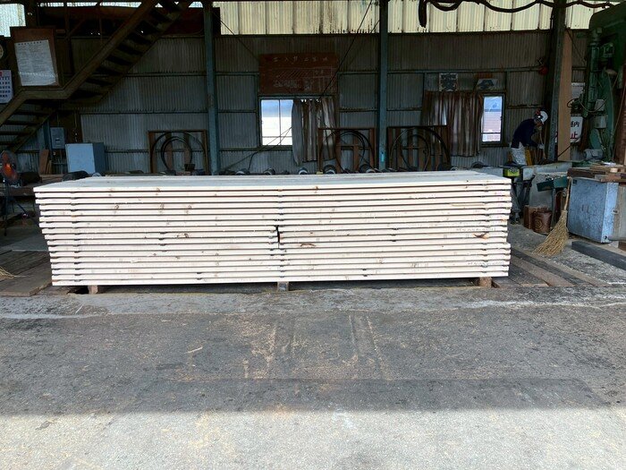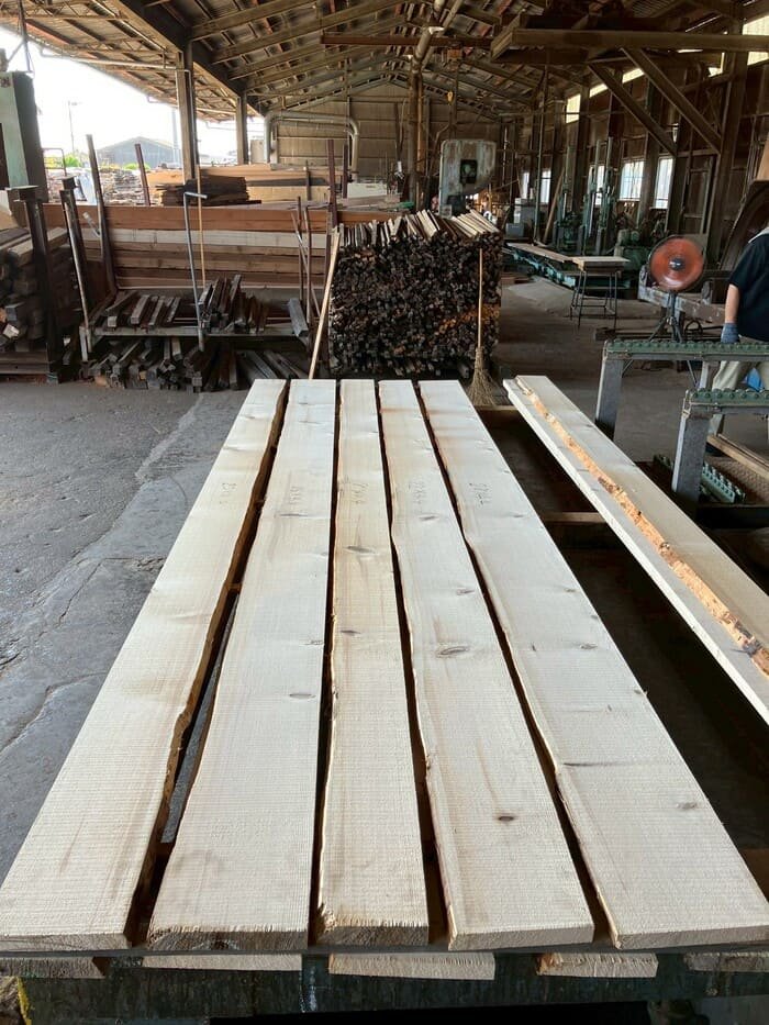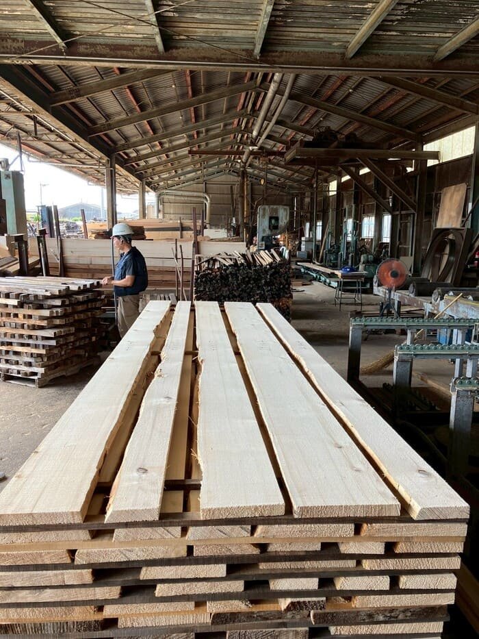 建具向けに長さ11mのバルサム丸太を元から2.2m、4.4m、4.4mにカットし厚み34mmに製材しています。