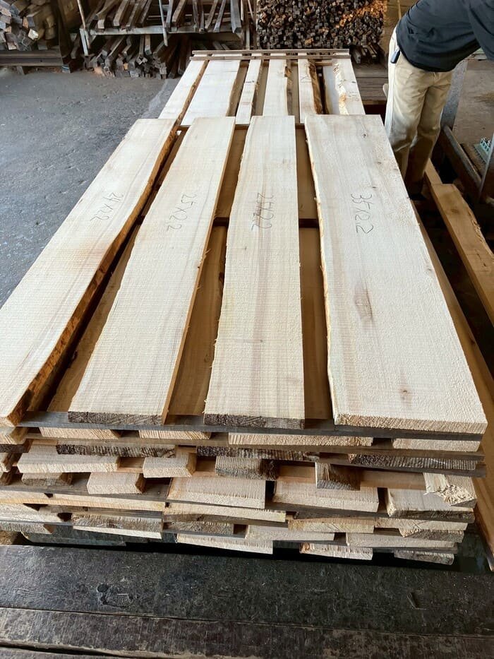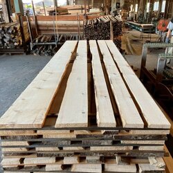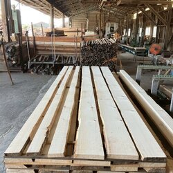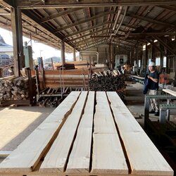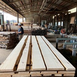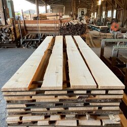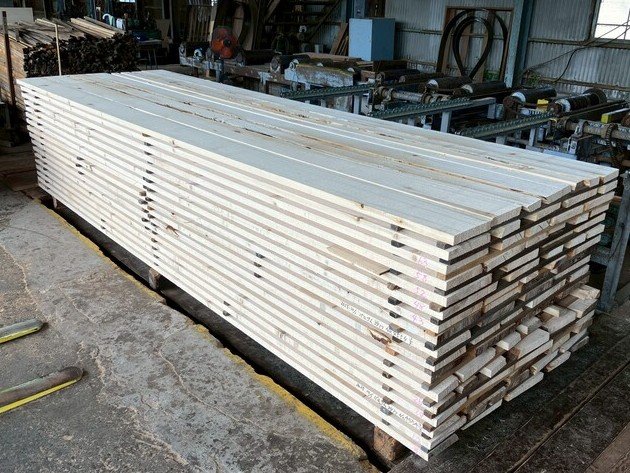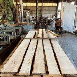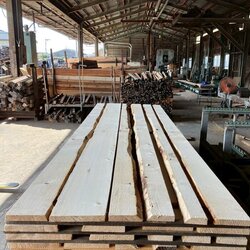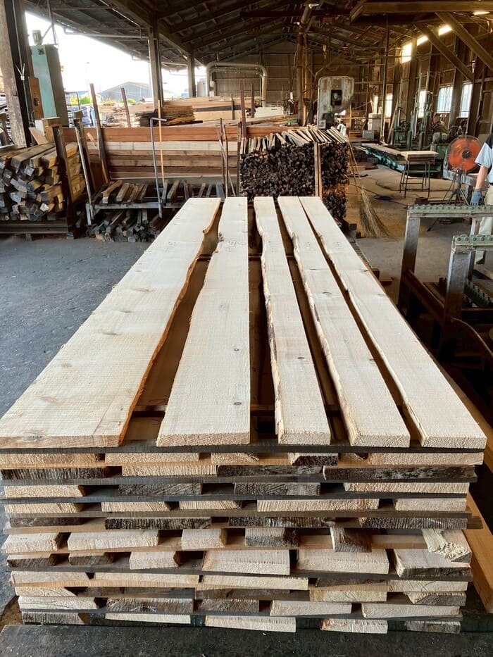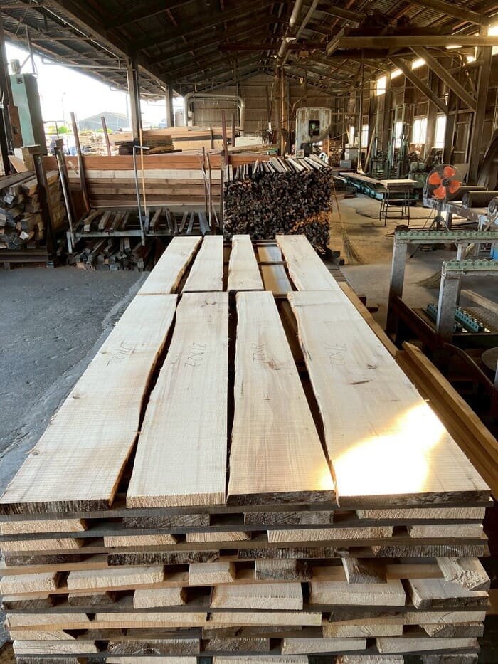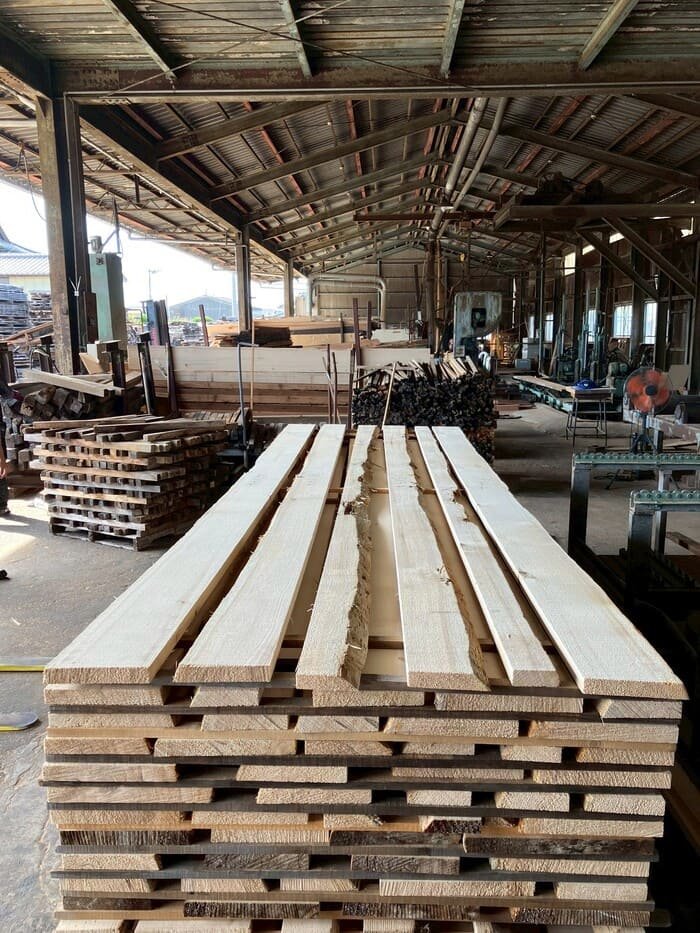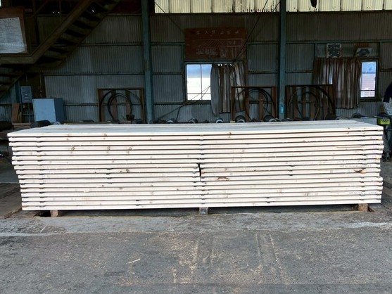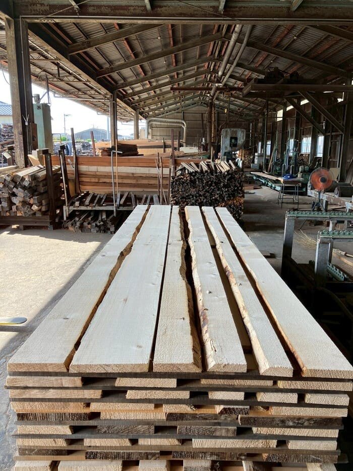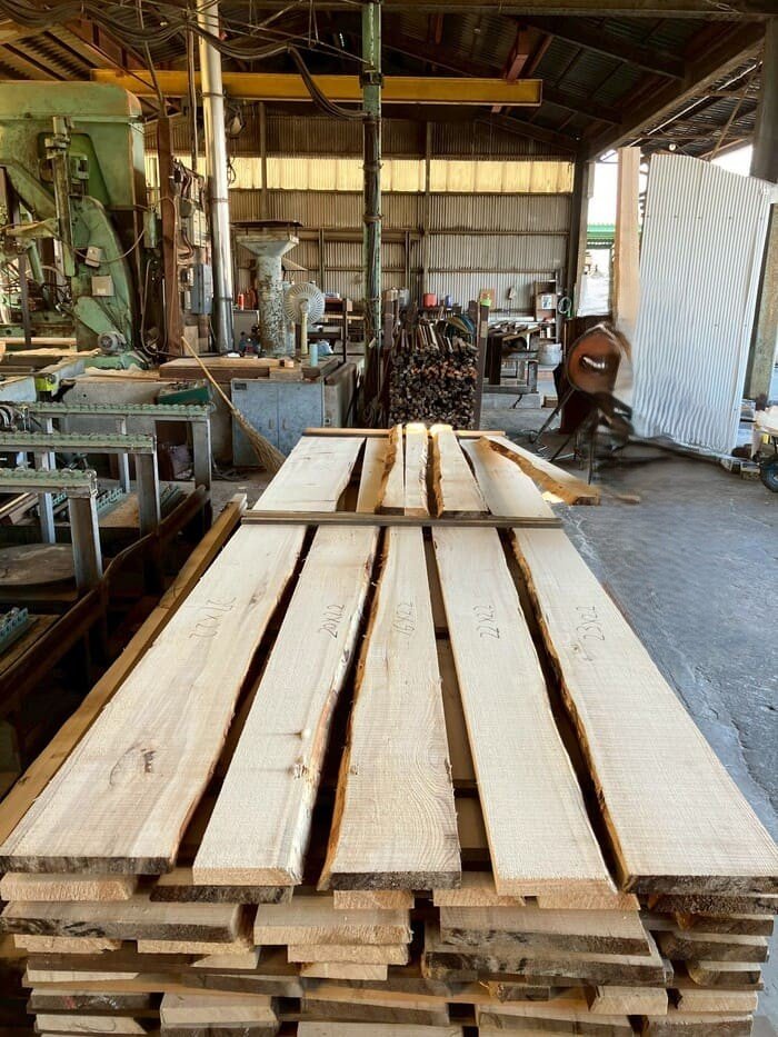 建具向けに長さ11mのバルサム丸太を元から2.2m、4.4m、4.4mにカットし厚み34mmに製材しています。