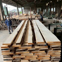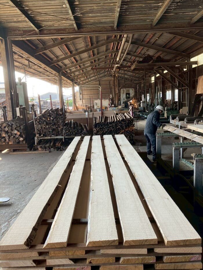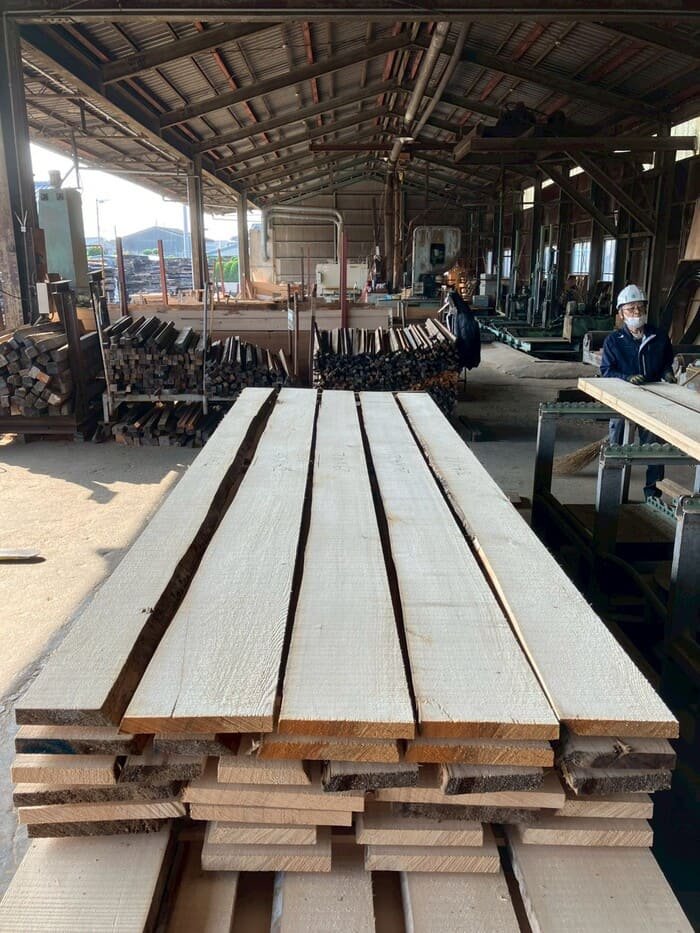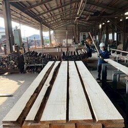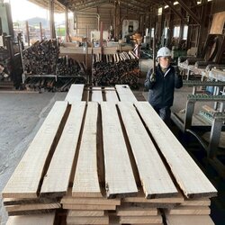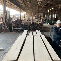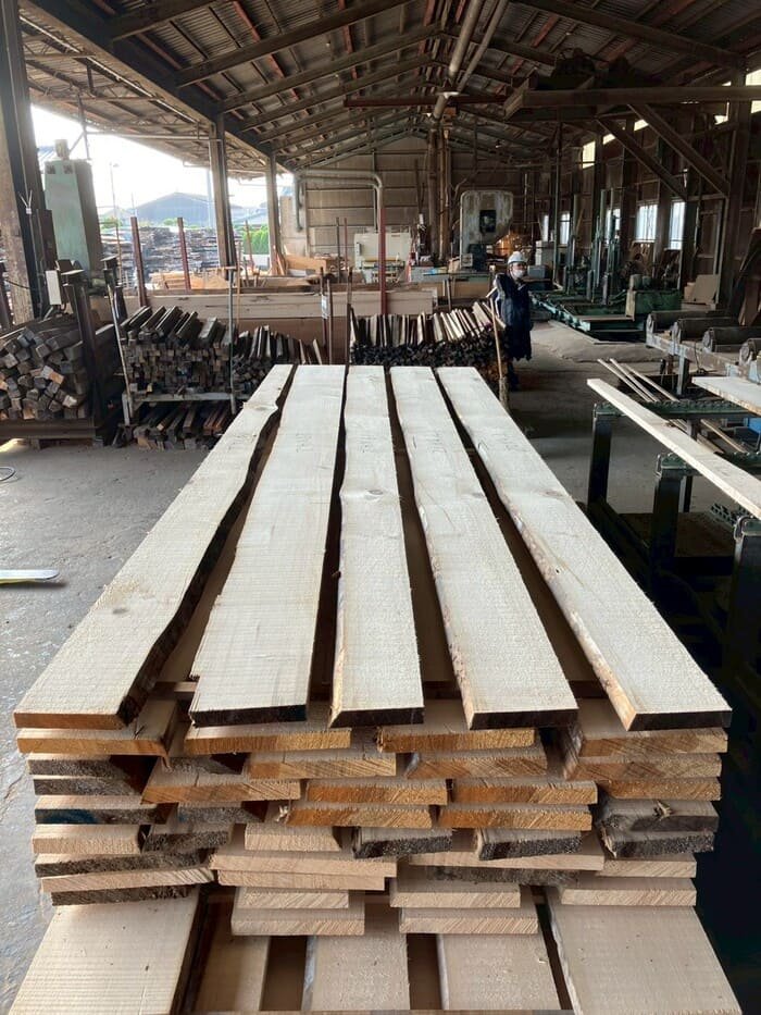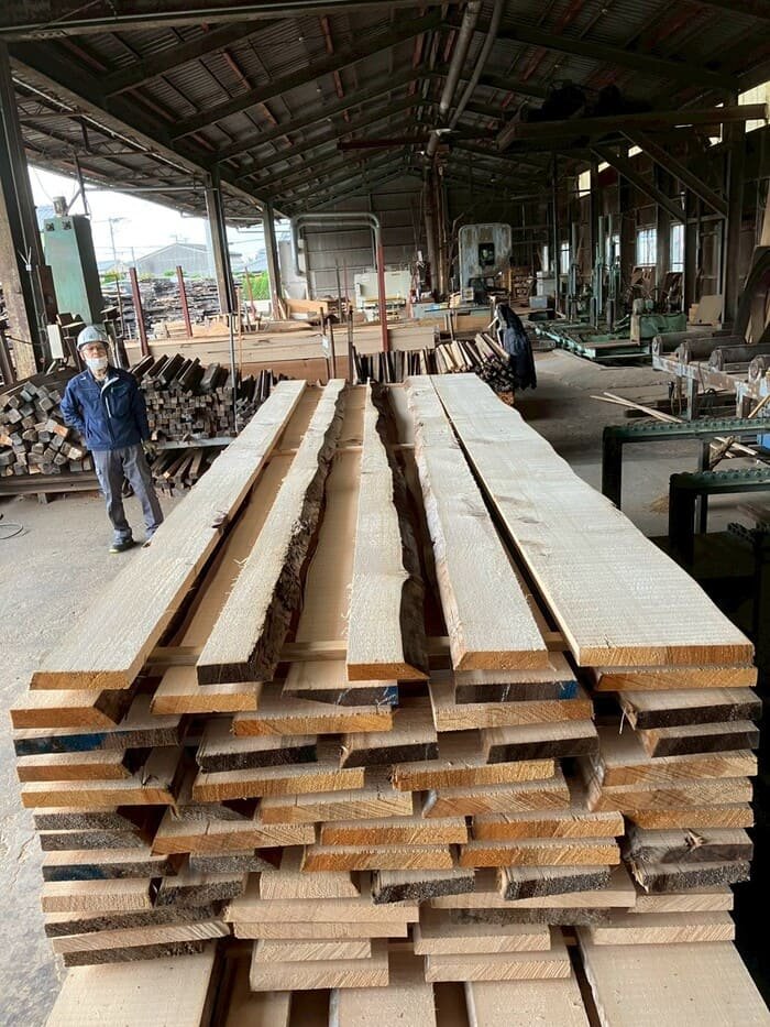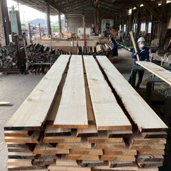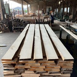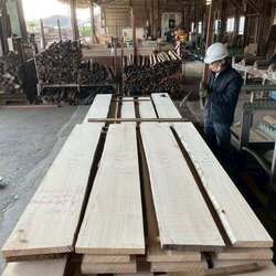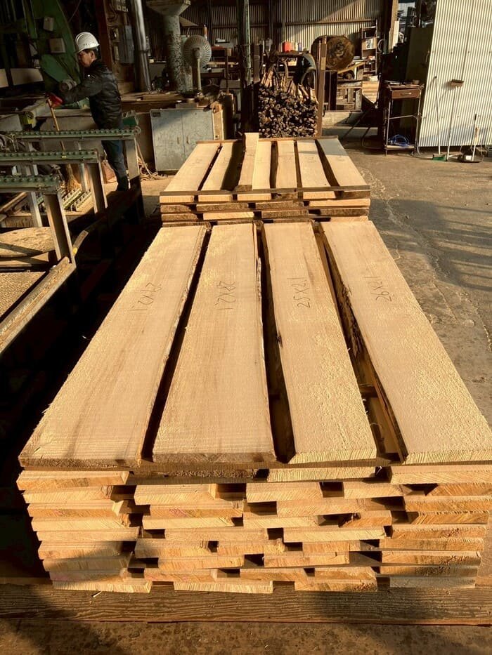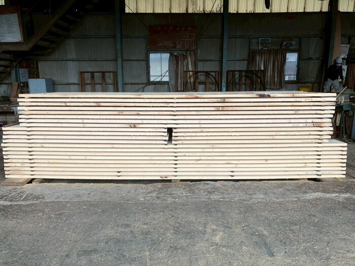 長さ11.2mのバルサム丸太を根側から2.1m、4.7m、4.2mにカットし、厚み34mmで製材をしています。