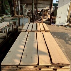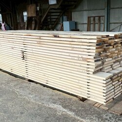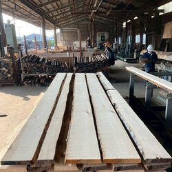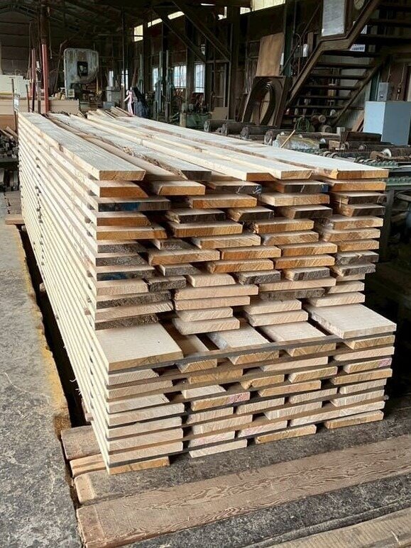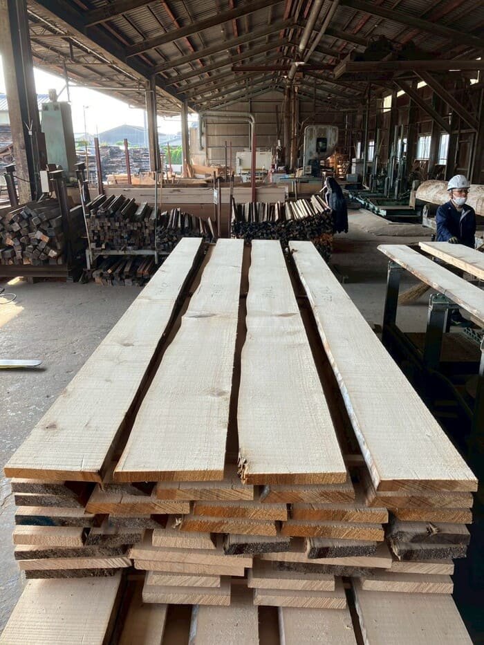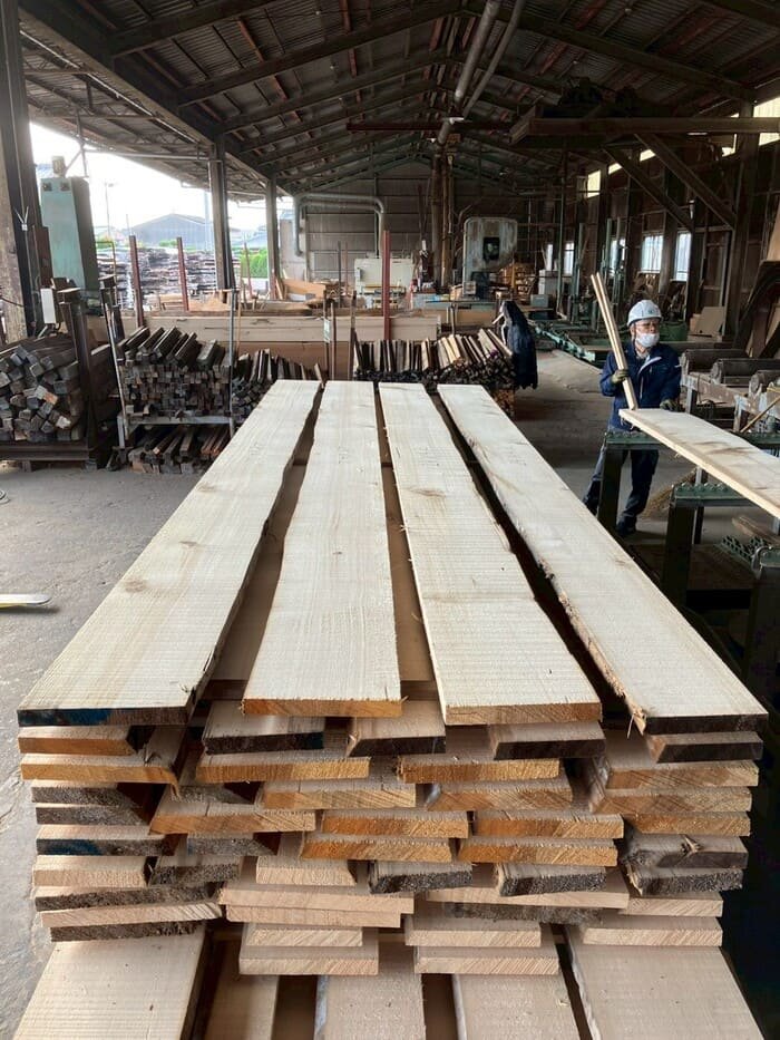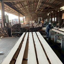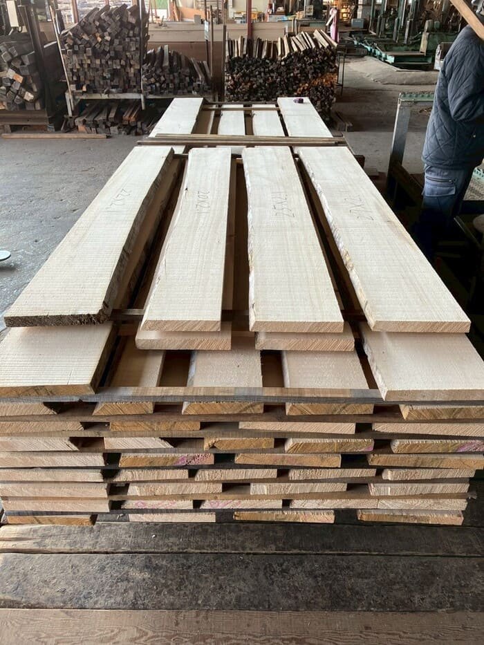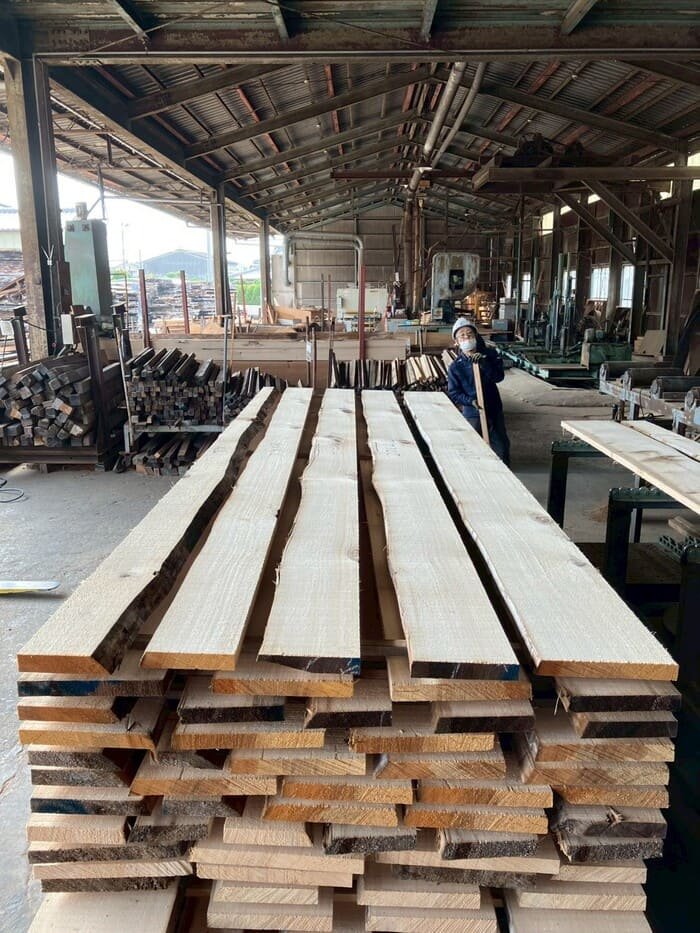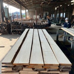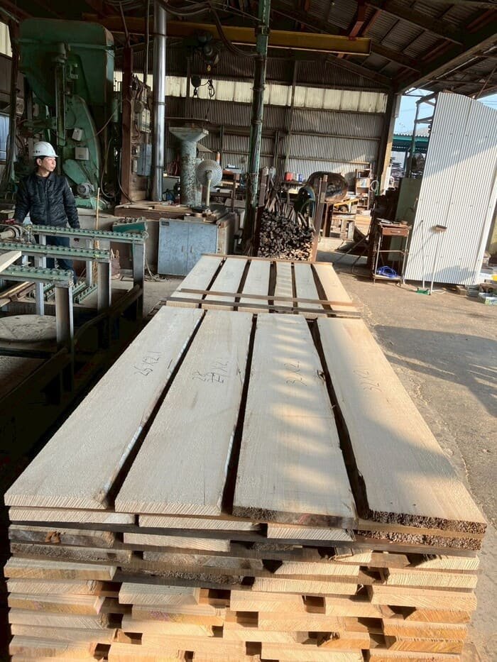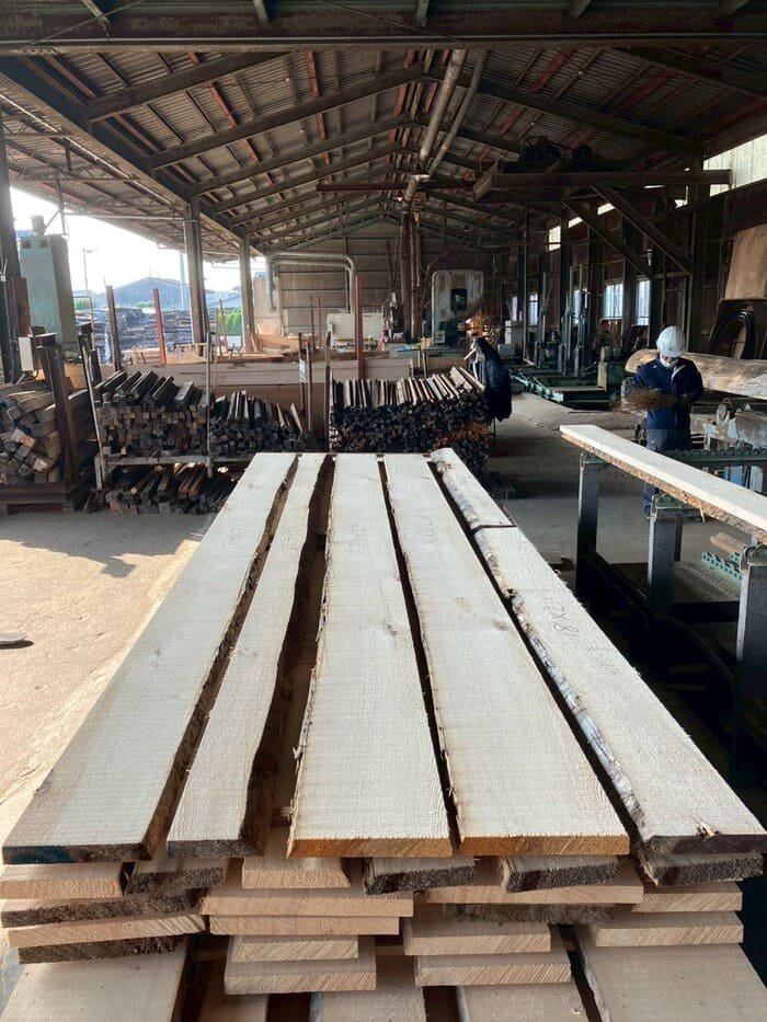 長さ11.2mのバルサム丸太を根側から2.1m、4.7m、4.2mにカットし、厚み34mmで製材をしています。