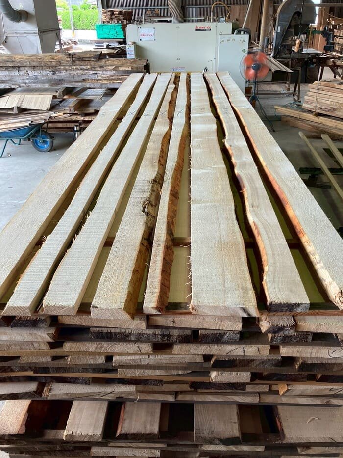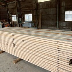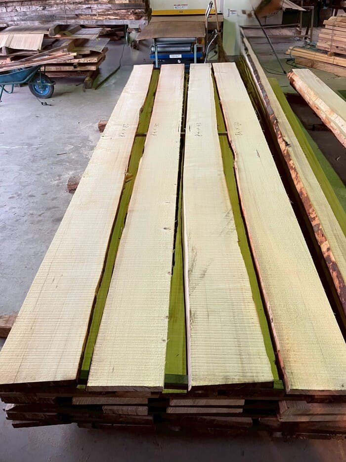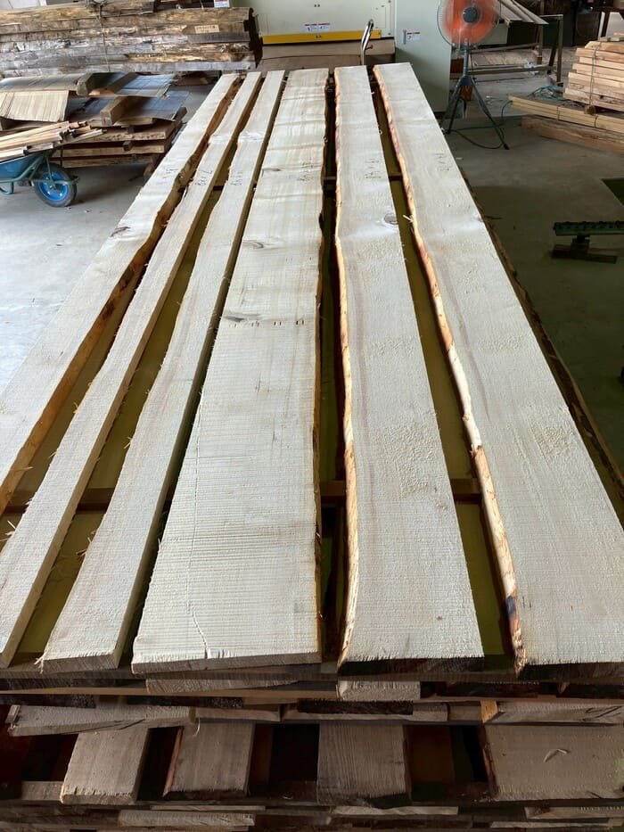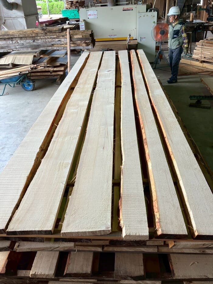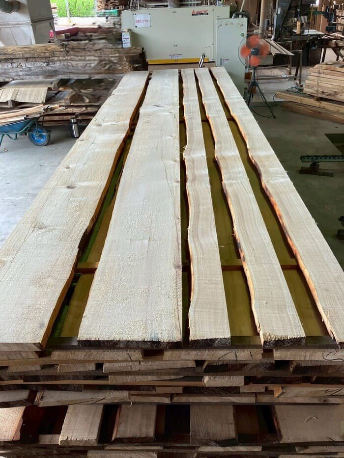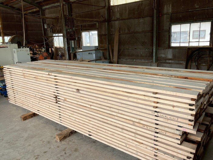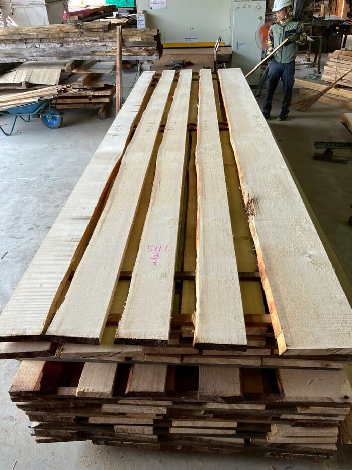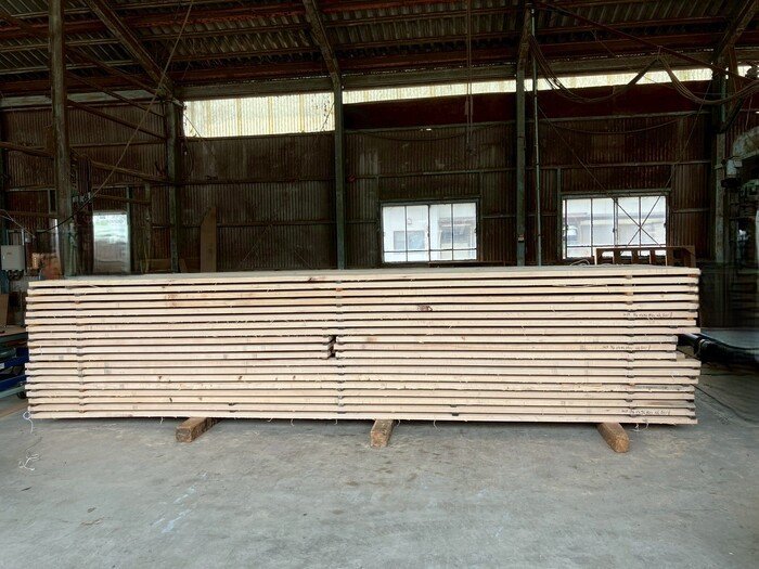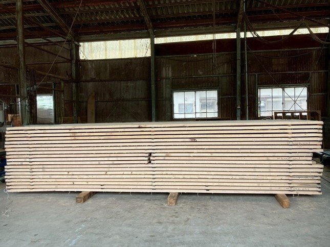 長さ11.9mのバルサム丸太を根側と末側を4.8mに、真ん中を2.3mに長さをカットし厚み34mmに製材しています。