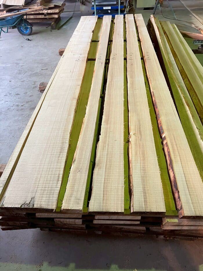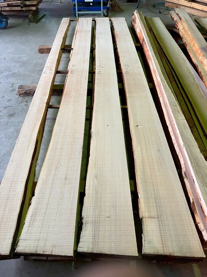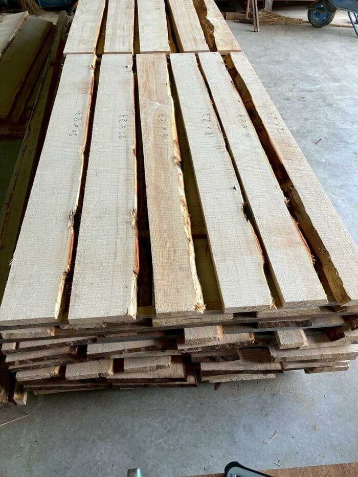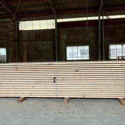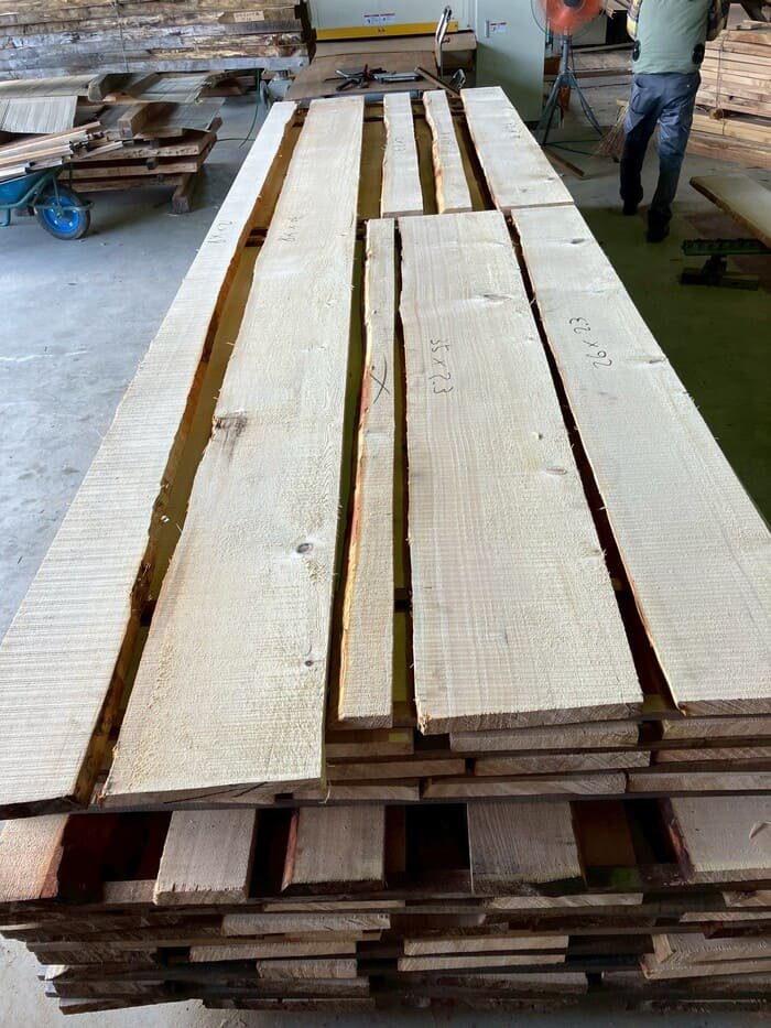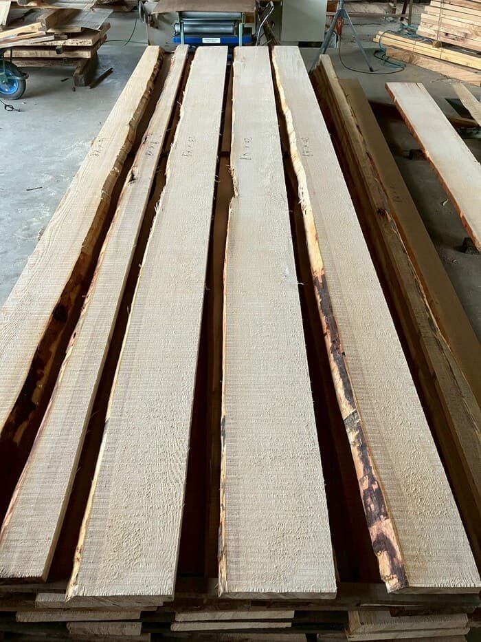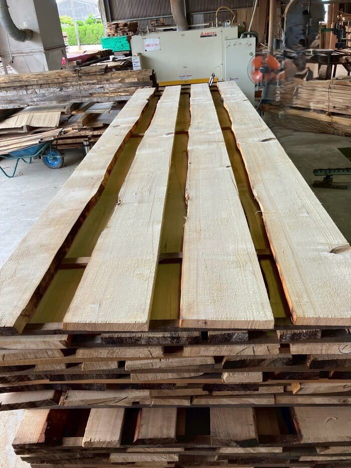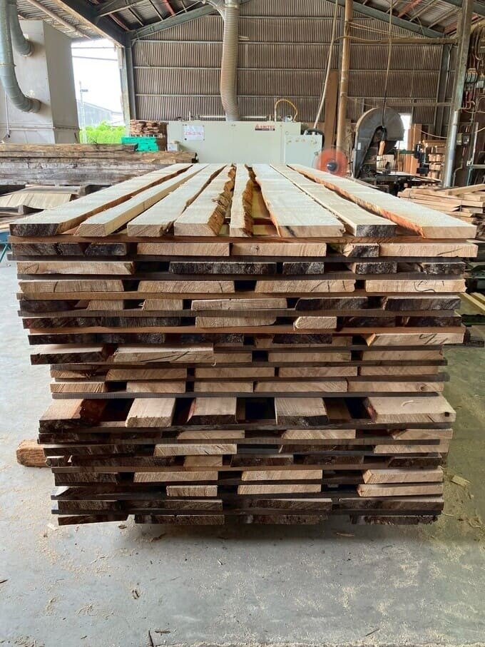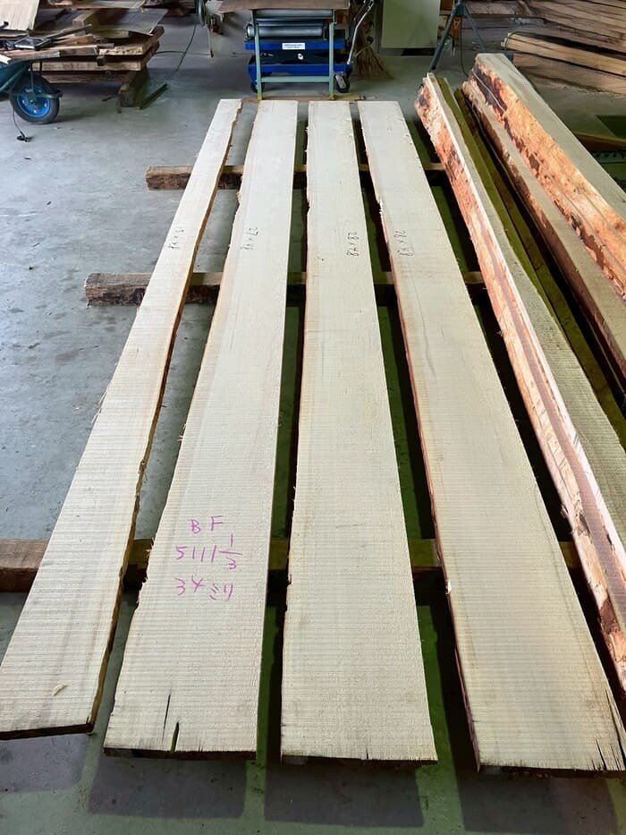 長さ11.9mのバルサム丸太を根側と末側を4.8mに、真ん中を2.3mに長さをカットし厚み34mmに製材しています。