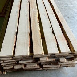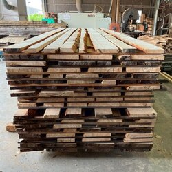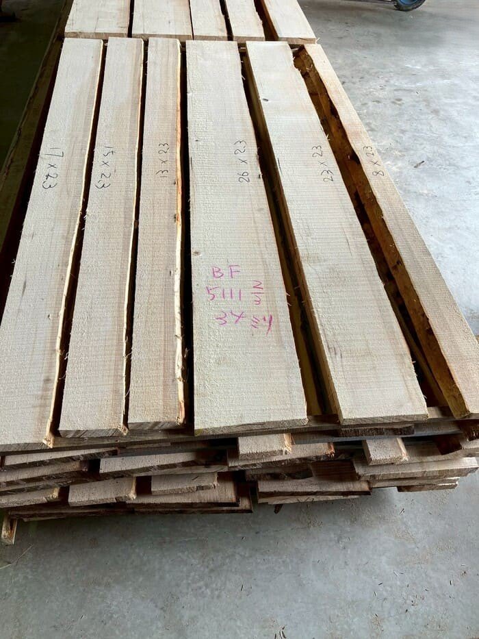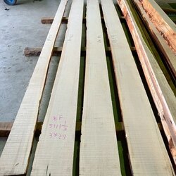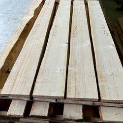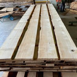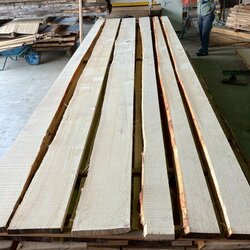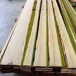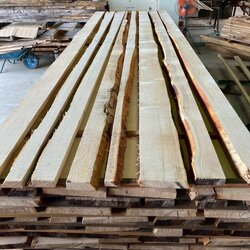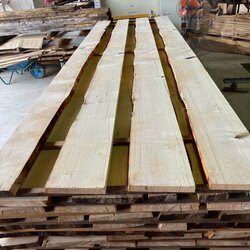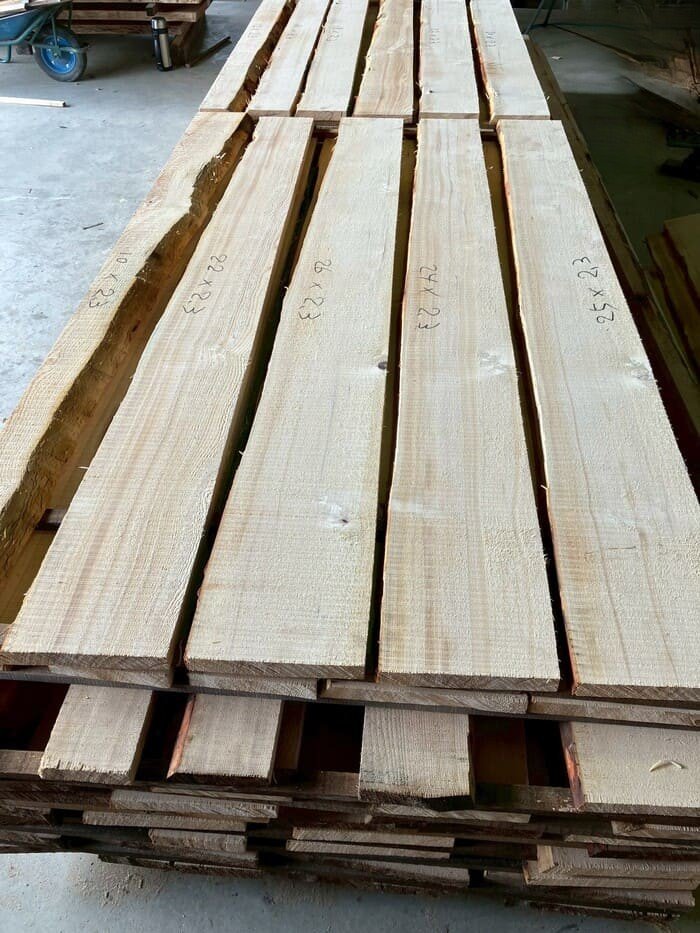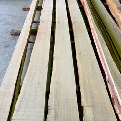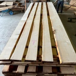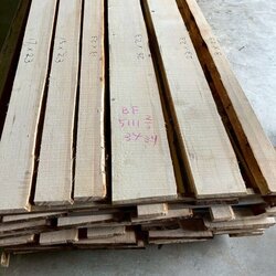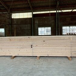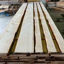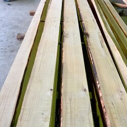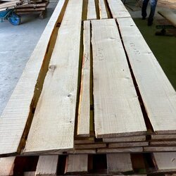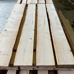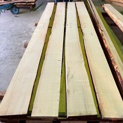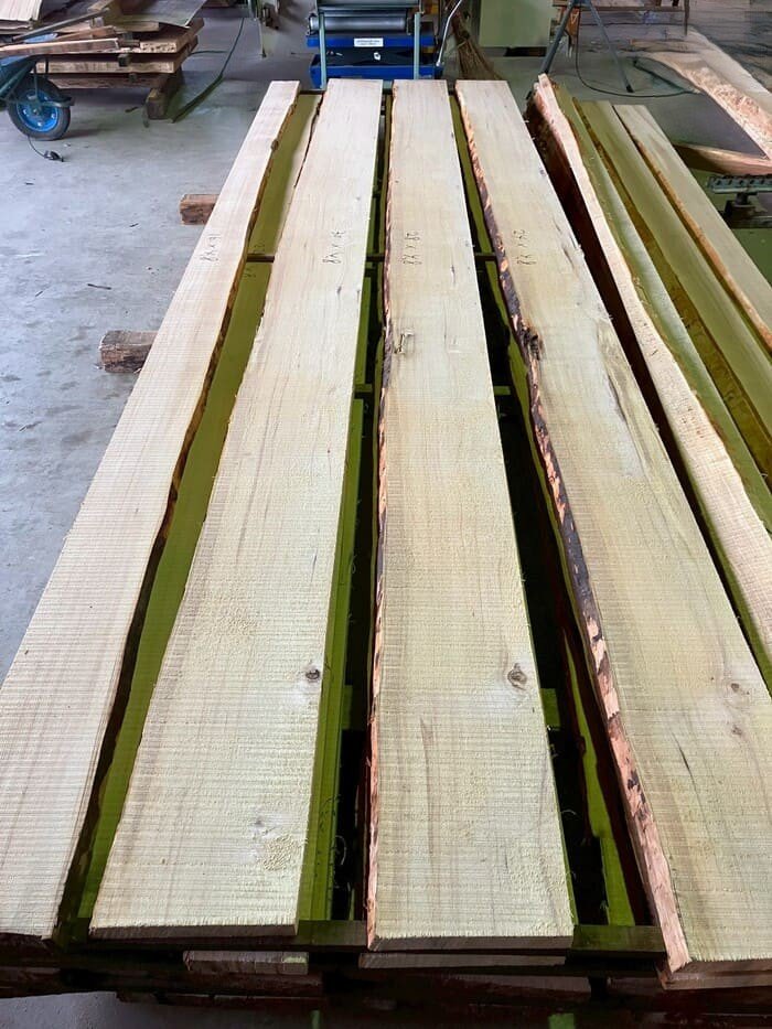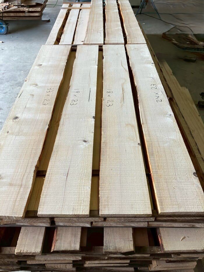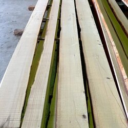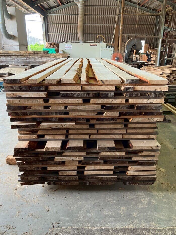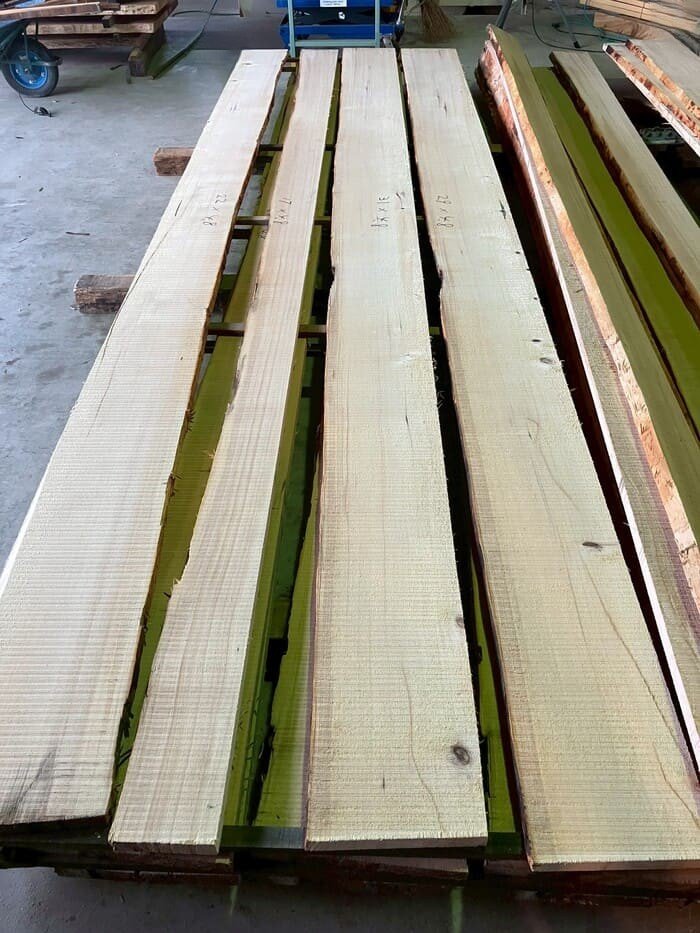 長さ11.9mのバルサム丸太を根側と末側を4.8mに、真ん中を2.3mに長さをカットし厚み34mmに製材しています。