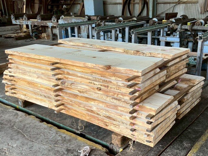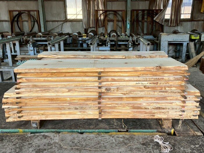 4.4mの檜丸太を、元側の2.4mと末側の2.0mに切り分けて製材しました。