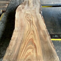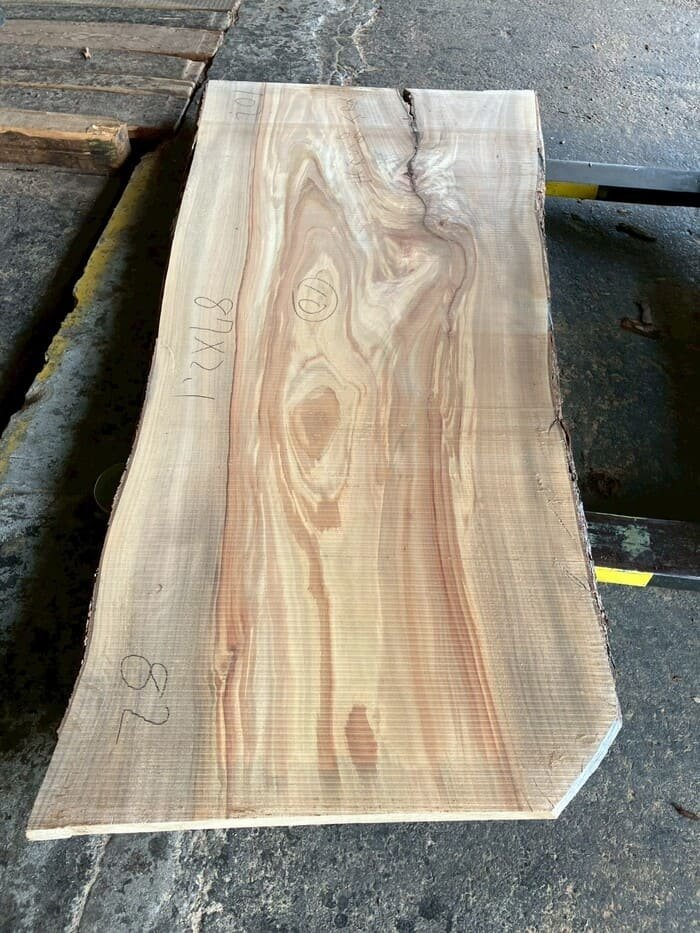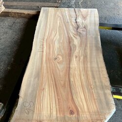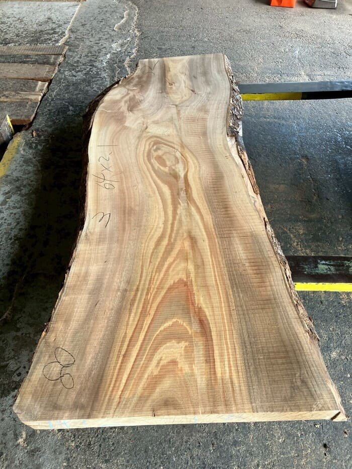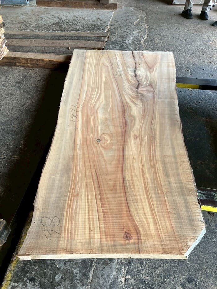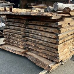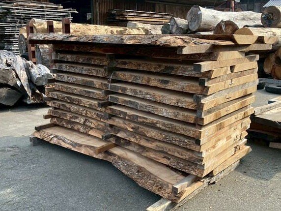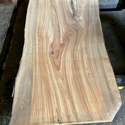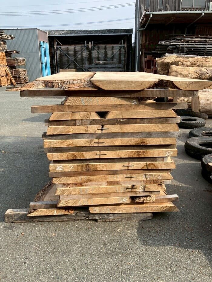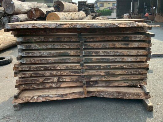 厚み60mm、天板向けに製材をしています。13枚のうち6枚に入皮や流れ節が入っています。