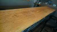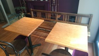 | 担当営業より | オーナー様からは「店内のテーブル類は全て同じ1本の原木から取れた板を使いたい」 とのご要望でしたので仕上りにはとてもご満足いただきました。 オーナー自ら木地研磨しオイル塗装仕上げです。 |