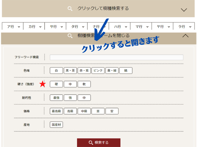 ※【クリックして樹種検索をする】をクリックして木材の硬さで検索できます。