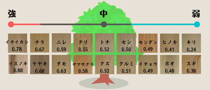 高田製材所の取扱樹種から、主要な国産材を「強・中・弱」の3段階で格付け。