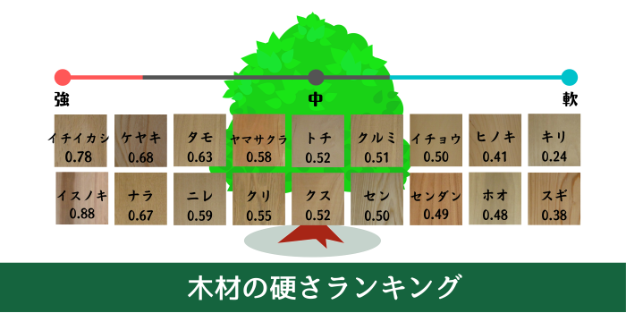 ホワイトオークよりピンク色で、加工性が良く、やや重硬で強度が高く、衝撃に強い材です。