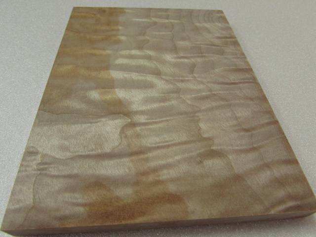 キルティッドメープルはメープルの丸太の中でも、このようなリーフ状のは部分はとても稀なので、杢が出ていないメープルに比べるととても高い価格になります。