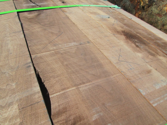 RUSTICグレードはメーカーによって等級づけの基準が若干違いますが、アメリカ広葉樹協会の規定の#1Cと#2Cの中間程度の材料です。#1C材よりも若干白太は少なく、色味も濃いめです。節を活かした味のある家具製作に多く使用されています。