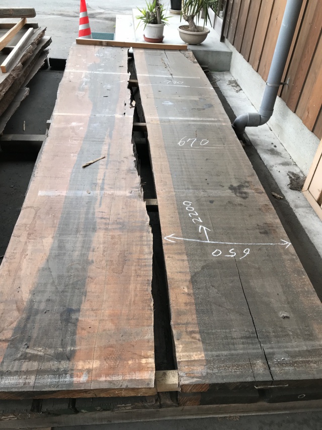 深い割れがない部分で長さ2800~2200mm、幅600~700mm程度の一枚板が取れる板が入っています。
